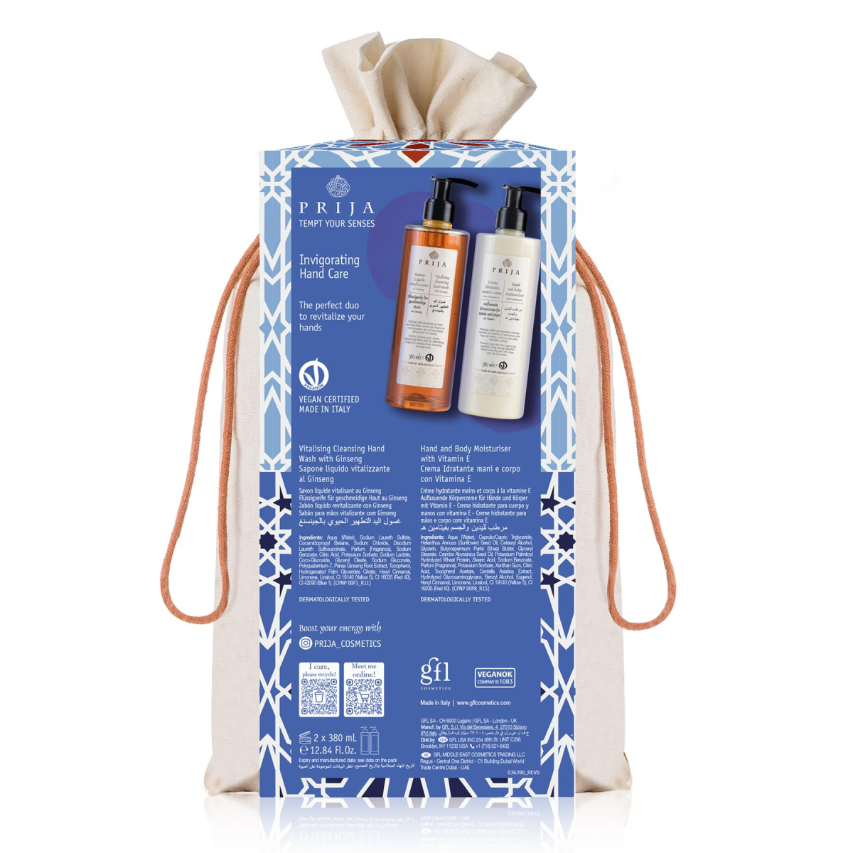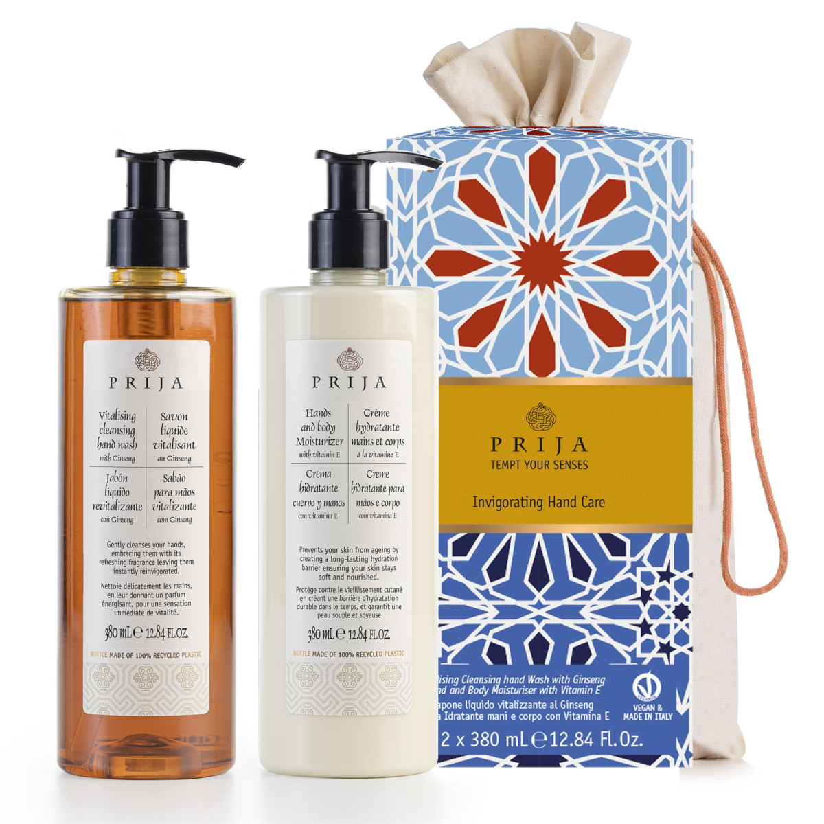 Sachet in natural cotton with selected cosmetics for your daily body care. Enjoy the natural beneficial properties of Prija. The eastern world has recognized Ginseng’s reinvigorating properties for many centuries. The combination of the natural oils and warm notes (Artemisia, Cardamom, Cedar Wood, Madagascan Vanilla, Amber) will stimulate your mind and body. Their special aromatherapy scents are taken from exotic plants from around the world. The lotions and cleansers have been specifically studied to reduce the possibility of allergic reaction in those with sensitive skin.