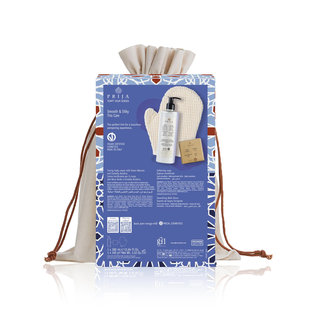 Sachet in natural cotton with selected cosmetics for your daily body care. Smoothing bath glove in natural cotton, in bag partly derived from corn starch. For soft and exfoliate skin, all over the body. Toning body cream with green walnuts and Centella Asiatica. Softening soap with high concentration of natural glycerin