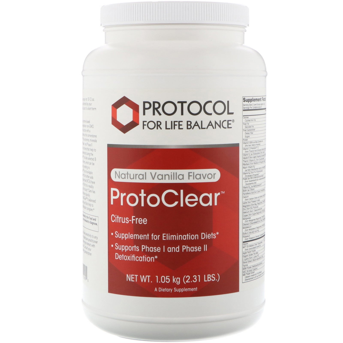 Citrus-Free Supplement for Elimination Diets Supports Phase I and Phase II Detoxification A Dietary Supplement How It Works: ProtoClear is a protein-based nutritional supplement utilizing a vegetarian non-GMO Pea Protein designed for use in conjunction with a comprehensive detoxification program as the cornerstone of an elimination diet. ProtoClear has vitamins, minerals and other nutrients that support Phase I and Phase II detoxification, as well as a blend of nutrients that help to protect against the free radicals generated during the detoxification process. ProtoClear includes selected B vitamins in their biologically active forms, which can be readily used by the cells of the body, needing no conversion by the liver. ProtoClear also has Apple Pectin, a naturally sourced ingredient that further aids detoxification. Medium chain triglycerides (MCTs) have been included as a healthy source of fat that is readily absorbed and utilized as energy by the body. Care has been taken to select ingredients that are typically nonreactive in most individuals. ProtoClear's balanced proportions of protein, carbohydrate, and fats help to sustain energy levels during a detoxification program.