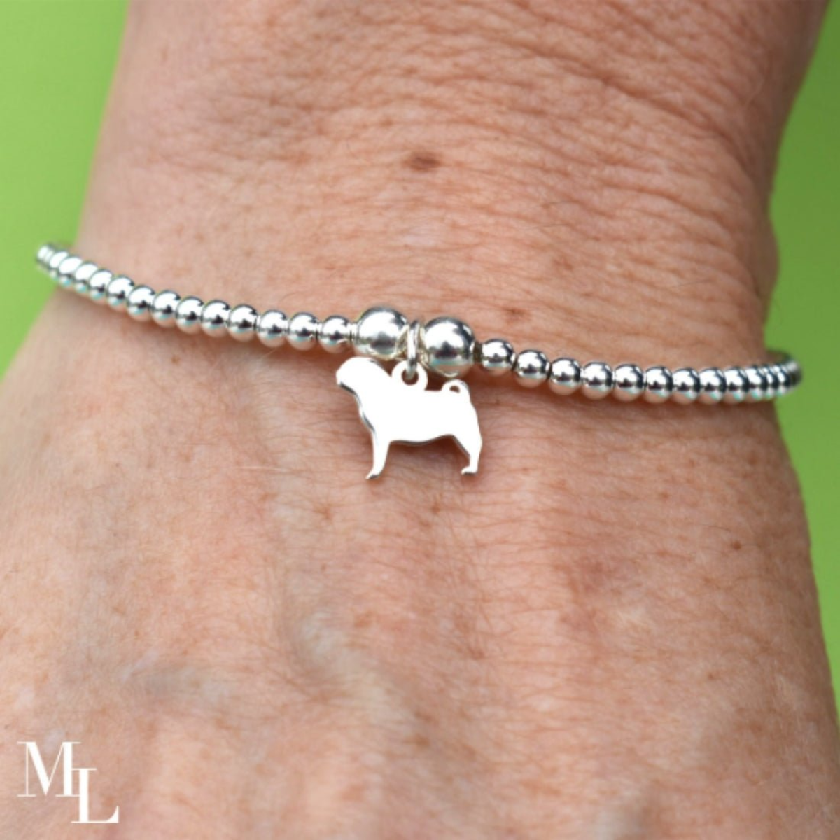 BuytoGive | Buy now | Pug Silhouette Silver Ball Bead Bracelet - Personalised