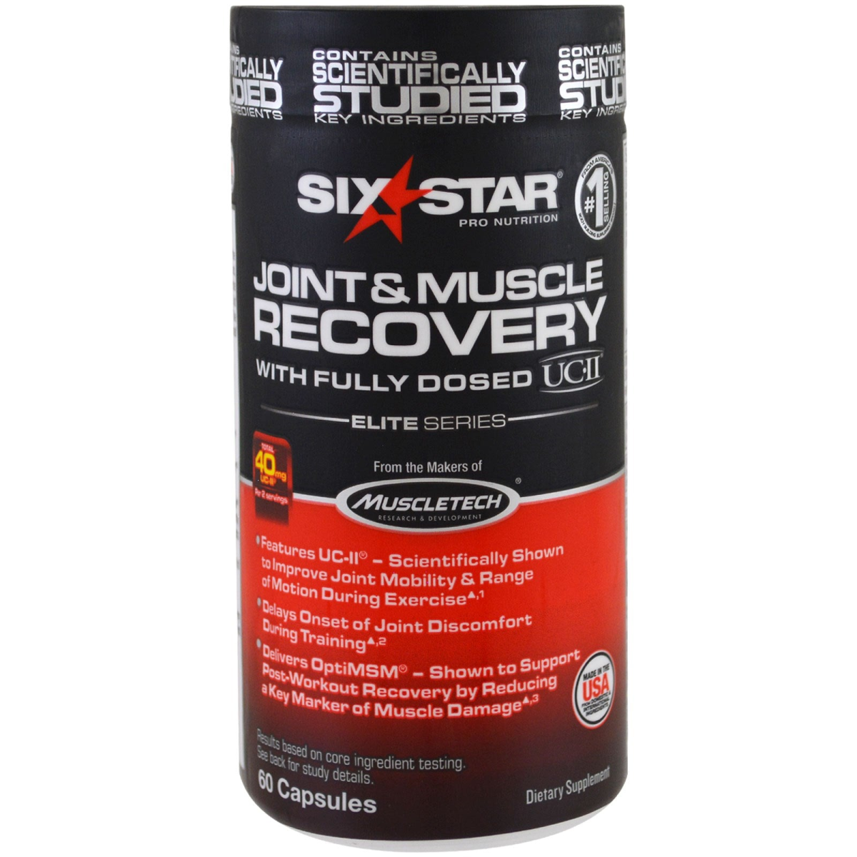 Contains Scientifically Studied Key Ingredients Pro Nutrition From America's #1 Selling Body Building Supplement Brand‡ With Full Doses UC-II From the Makers of MuscleTech Total 40 Mg UC-II Per 2 Servings Features UC-II - Scientific Show to Improve Joint Mobility & Range of Motion During Exercise¹ Delays Onset of Joint Discomfort During Training² Delivers OptiMSM - Shown to Support Post-Workout Recovery by Reducing a Key Marker of Muscle Damage³ Made in the USA From Domestic & International Ingredients Dietary Supplement 20 Year of Excellence Leader In Science Guaranteed Banned Substance cGMP Manufactured- Manufactured According to cGMP Standards, As is Required for all Dietary Supplements Why Six Star Joint & Muscle Recovery with a Fully Dosed 40 mg of UC-II Is the Smarter Choice Six Star Joint & Muscle Recovery with a fully dosed 50 mg of UC-II is from the makers of Muscletech, America's #1 Selling Body Building Supplement Brand, so you know it's a powerful formula you can trust. Six Star Joint & Muscle Recovery features key ingredients UC-II and OptiMsm to improve joint mobility during exercise and support muscle recovery to experience the difference for yourself and get the results you want today! Who Is Six Star Joint Muscle Recovery For? Active Men & Women Athletes Strength Trainers Fitness Enthusiasts Body Builders Endurance Athletes What Are the Benefits of Six Star Joint & Muscle Recovery? Significantly improves range of motion and joint mobility during exercise¹ Delays onset of joint discomfort during training² Supports post-workout recovery by reducing a key marker of muscle damage³ Scientific Study Shows Improved Joint Mobility ¹In a study on 46 subjects, individuals using a core ingredient in Six Star Joint & Muscle Recovery in combination with a training protocol significantly increased their range of motion of knee extensions compared to subjects using a placebo (81 vs 74 degrees). ²In the same study, subjects also significantly increased their time to onset of initial joint discomfort during exercise compared to the baseline. Reduce Key Marker or Muscle Damage ³Subjects using another core ingredient in Six Star Joint & Muscle Recovery experienced a significant decrease in a key marker of muscle damage at 2 and 24 hours post-workout compared to subjects using a placebo. ‡MuscleTech is America's #1 Selling Body Building Supplement Brand based on cumulative wholesale dollar sales 2001 to present.