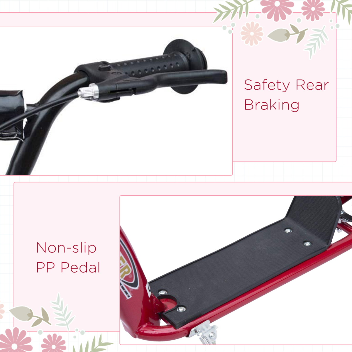 - SAFE TO USE: Brakes on the rear wheel for a swift stop. Wide non-slip deck of the offroad scooter for balance when scootering. Two 12" foam wheels with plastic disks for a smooth ride.