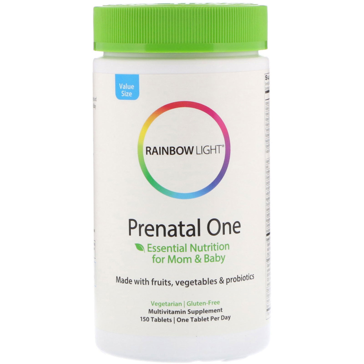 Value Size Essential Nutrition for Mom & Baby Made with Fruits, Vegetables & Probiotics Vegetarian - Gluten-Free Multivitamin Supplement One Tablet Per Day Healthy Mom, Healthy Baby! Nourish your body with our multivitamin that delivers clinically researched ingredients, our rainbow blend of fruits and vegetables, and an advanced Digestive Support Blend designed just for Mom and Baby from conception through nursing. What a difference 1 tablet per day makes: Nourishes Mom's health and Baby's development with the recommended amount of folate, calcium, choline and a gentle, well-tolerated form of iron. Promotes cell & immune health & energy with potent vitamins Easy to digest and with probiotics and plant-source enzymes