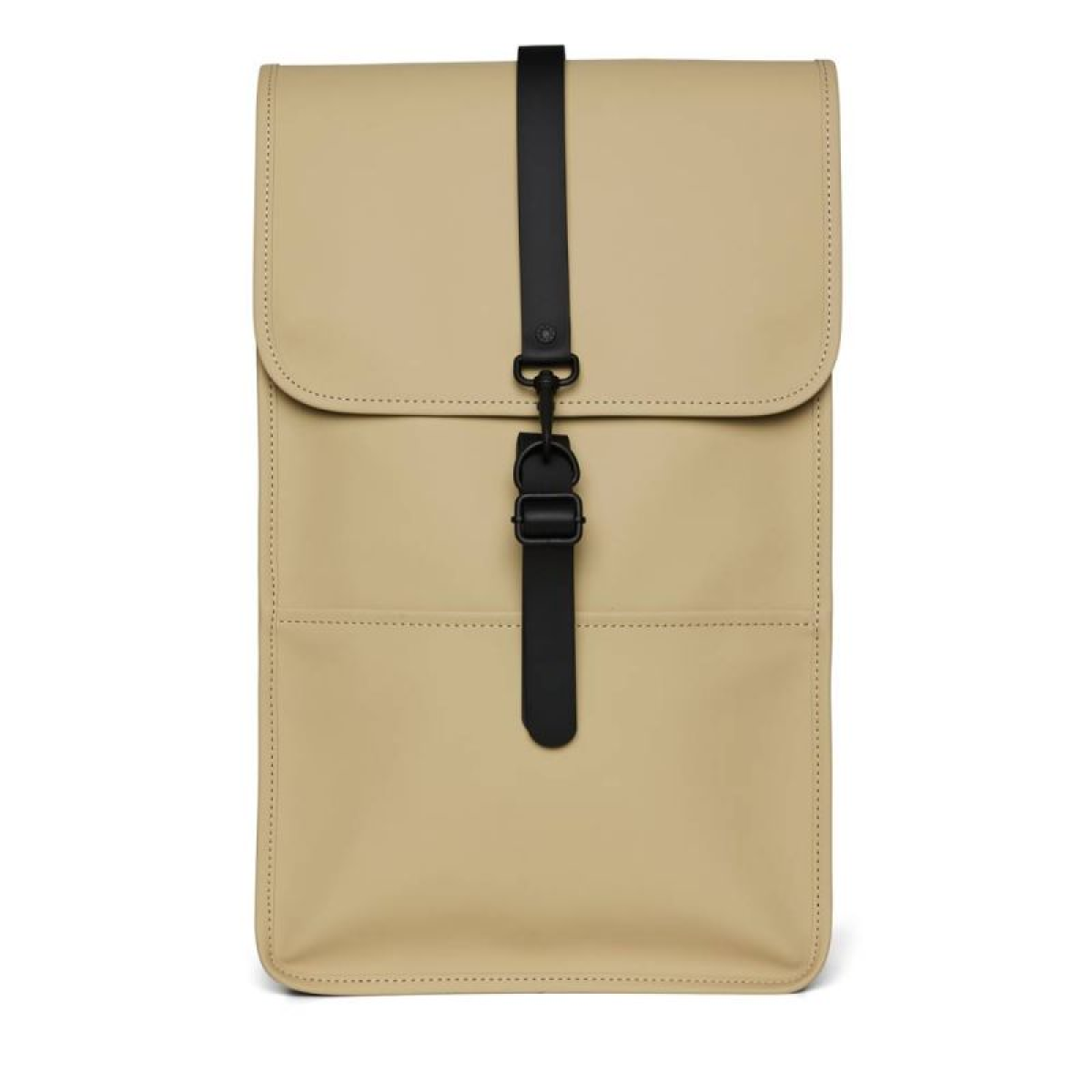 • The backpack silhouette is a Rains classic, featuring a raised flap and a central strap with a snap hook closure. This clean and ever modern waterproof backpack features an internal laptop sleeve, a spacious main compartment and a hidden external phone pocket on the back panel.