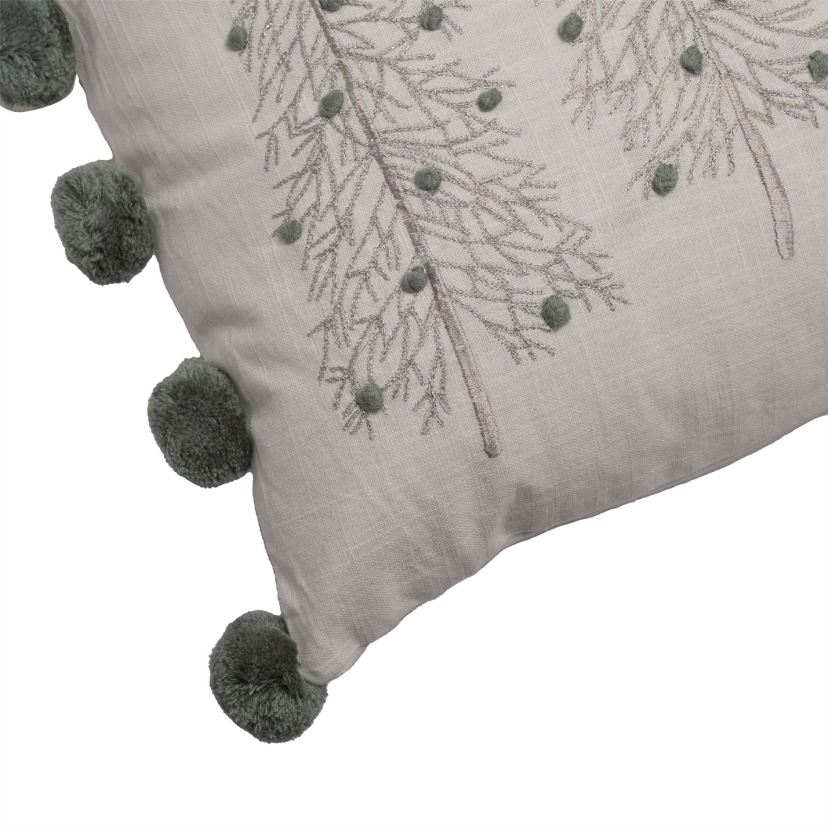The cotton cushion showcases gorgeous white colouring to both sides and is finished with a series of silver embroidered Christmas tree designs. It is furthered by grey pom poms on either side.