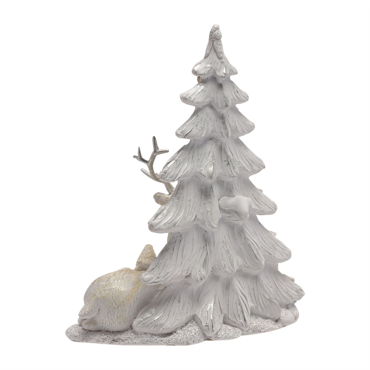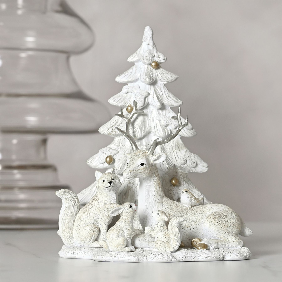 The white resin figurine showcases a reindeer sitting by the Christmas alongside squirrels and a rabbit. It is completed by a frosted finish with glitter touches.