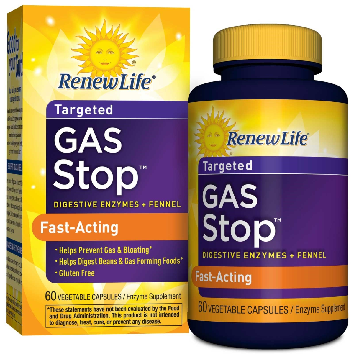 Digestive Enzymes + Fennel Fast-Acting Helps Prevent Gas & Bloating Helps Digest Beans & Gas Forming Foods Gluten Free Enzyme Supplement Dairy Free No Artificial Ingredients Digestive wellness, Naturally At Renew Life, we believe a healthy gut is a happy gut. For nearly two decades, we have pioneered superior-quality digestive care supplements to help people achieve optimal health from the inside out. Targeted Enzyme Blend - For Relief of Occasional Gas Our targeted digestive enzyme blends are formulated for your body's unique needs so you always feel your best. Gas Stop is a fast-acting, potent digestive enzyme blend that helps break down gas-forming foods to relieve occasional gas, bloating, and pressure. It also contains soothing fennel seed to help relax the digestive tract so you feel comfortable again. Good for your Gut! Your gut is your engine, your digestive core. Keep it running smoothly at every meal with Renew Life digestive enzymes. Our plant-based, broad-spectrum blends promote optimal digestion and nutrient availability so you feel better, lighter, and more energized. Benefits You Can Feel Did you know that highly processed and cooked foods may lack the enzymes needed to optimize good digestion? As a result, your body may have to work harder to break down and absorb nutrients, causing occasional gas, bloating, and indigestion. Our potent formulas work hard to reduce occasional digestive discomforts and unlock the nutrient goodness found in your food. Advanced-Smartzyne Blend Renew Life uses an advanced blending process called SmartZyme to ensure that our enzyme formulas are active over the broad range of pH levels found in your digestive system.