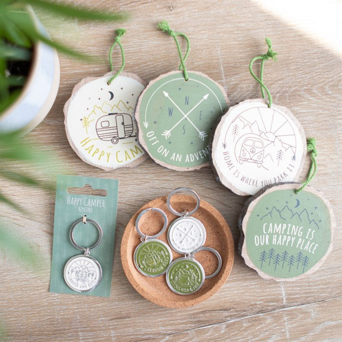 This display includes 16 wood slice-effect hanging signs perfect for any lover of the outdoors, camping or caravanning. 4 assorted styles include 'Camping is Our Happy Place (green), 'Home is Where You Park It' (cream), 'Happy Camper' (cream) and 'Off on an Adventure (green). Comes on a matching MDF countertop display.