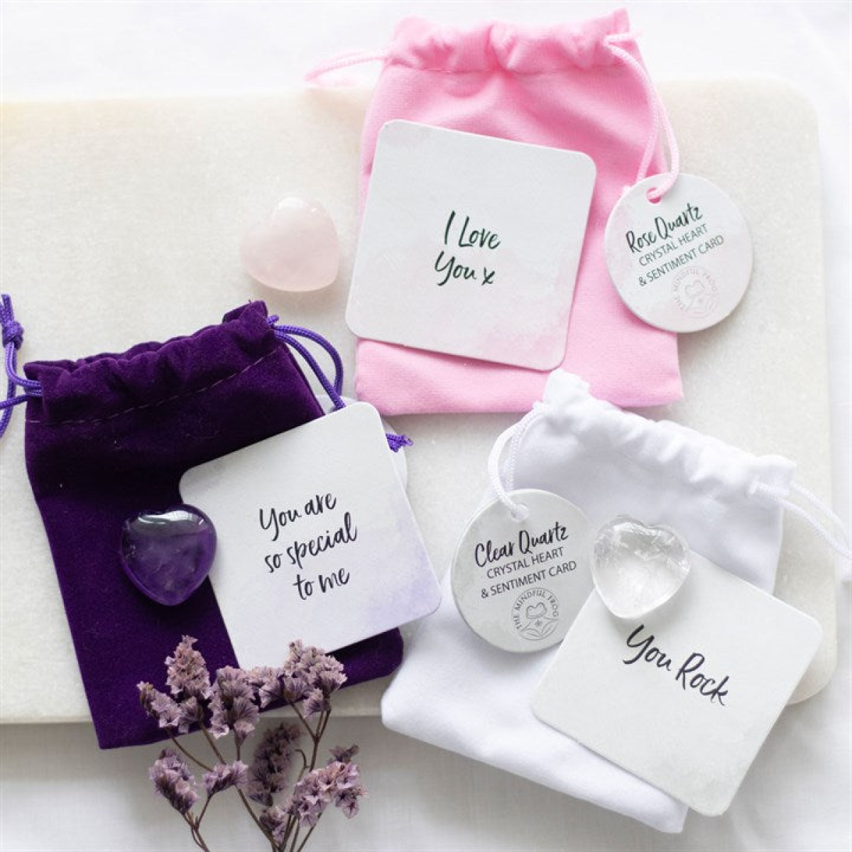 This stunning set of 24 Lucky Crystal Hearts are elegantly presented in a matching display box. The amethyst crystal heart promotes clarity, protection and the cleansing of negative energies and includes an informational "You are so special to me" sentiment card. The clear quartz lucky crystal heart promotes clarity, peace and purification of negative energies and includes an informational "You rock" sentiment card. The lucky rose quartz crystal heart promotes love, friendship and confidence and includes an informational "I love you x" sentiment card. These charming crystal hearts make a meaningful token of inspiration and empowerment for anyone in need for some extra positivity. The set include x8 of each crystal with matching velvet drawstring bags.