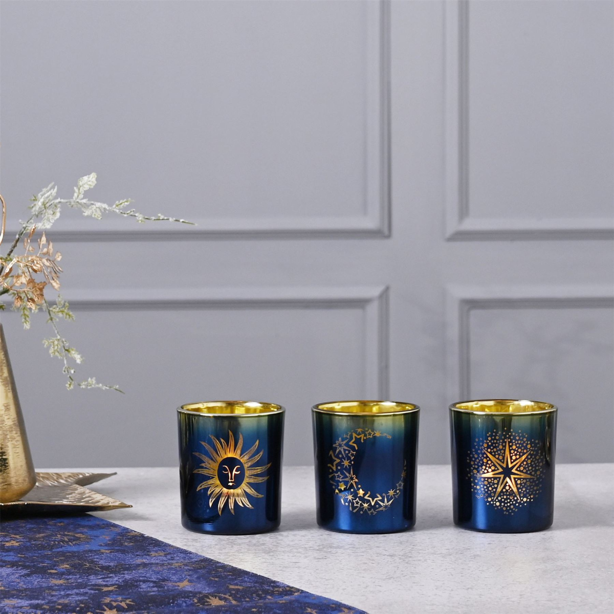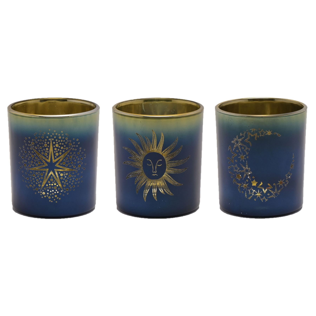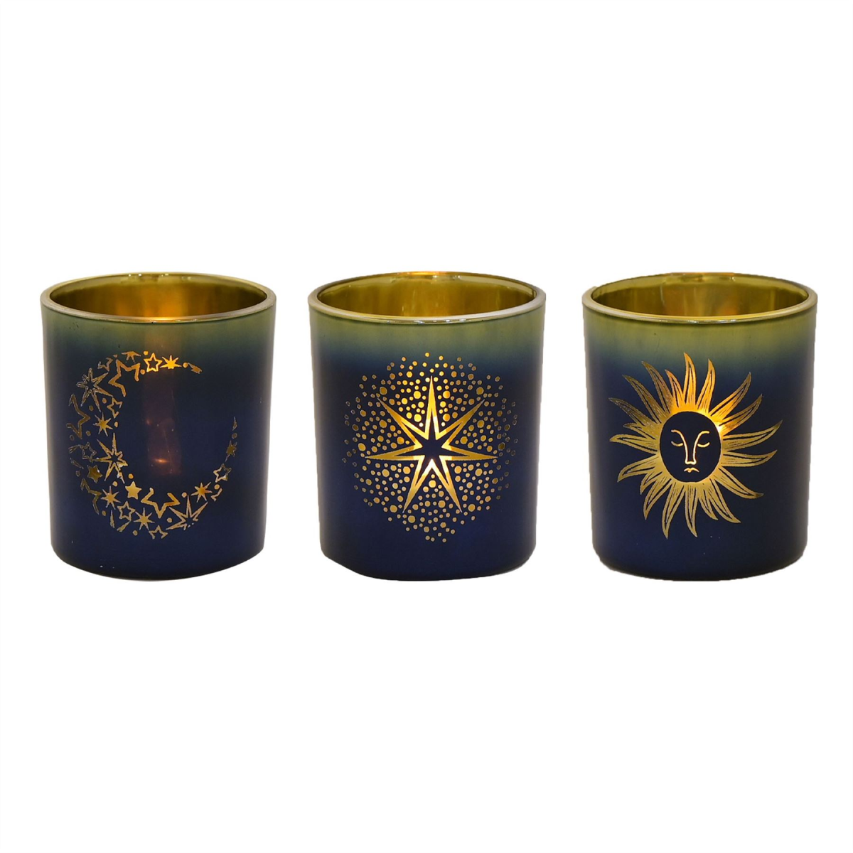 The glass votives showcase gorgeous navy blue and gold ombre colouring, complete with individual star, sun & moon designs and matching gold rim. They provide ample room for a tea light or small candle of choice.