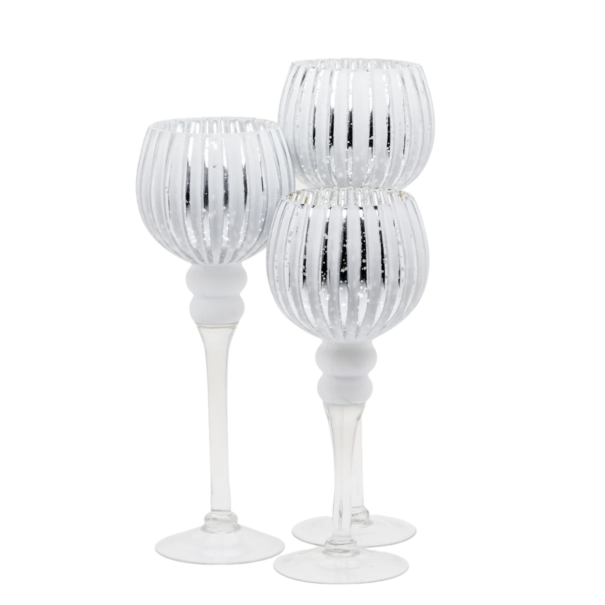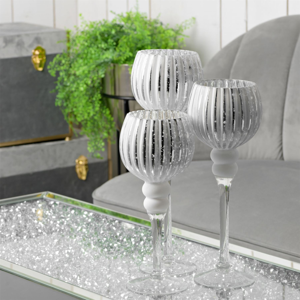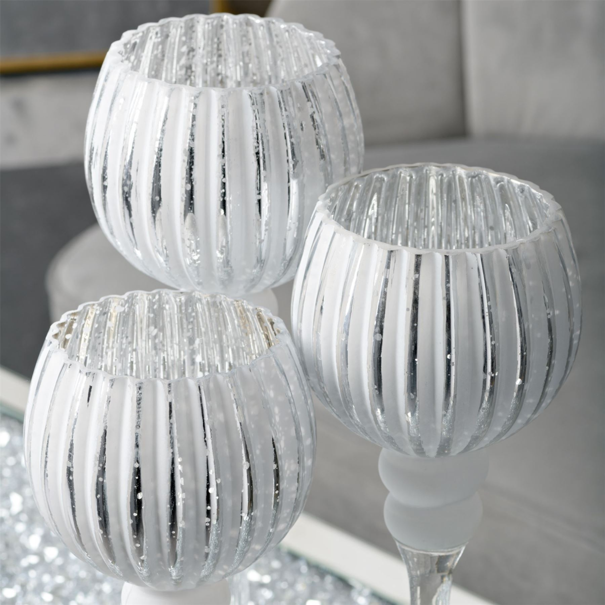 A set of three glass ribbed goblet style candle holders. From the Silver Luxe collection by HESTIA� - Unparalleled glamour, style and elegance in contemporary home and gift. The perfect home accessory to add a touch of sophisticated glamour and sparkle.