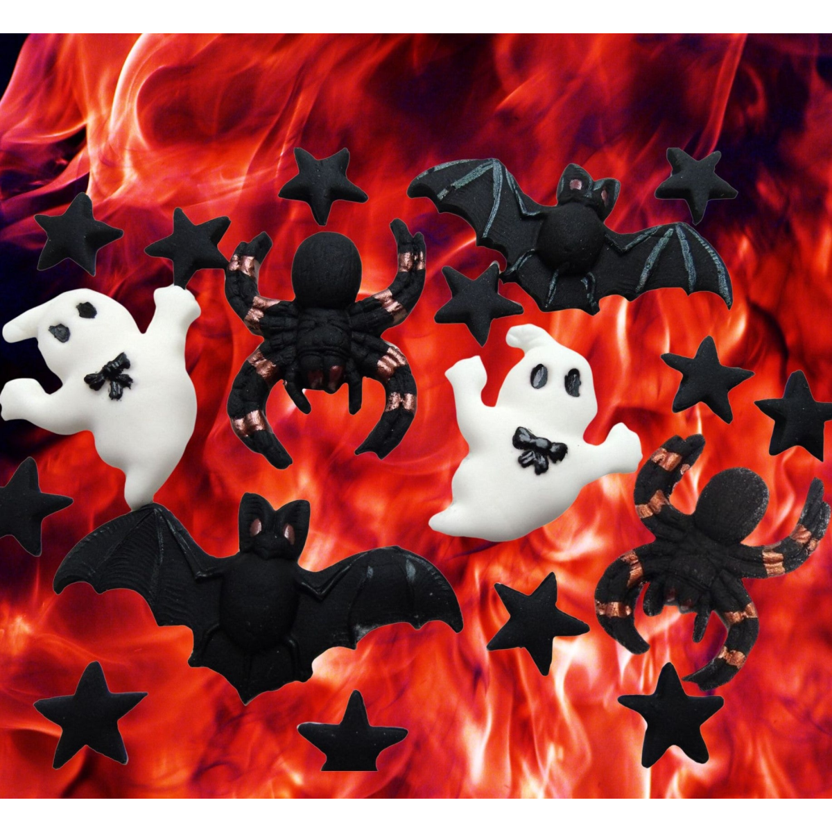 Transform your Halloween baked goods into spooky festive delights with our Set of bats, spiders, & ghost edible cupcake topper decorations