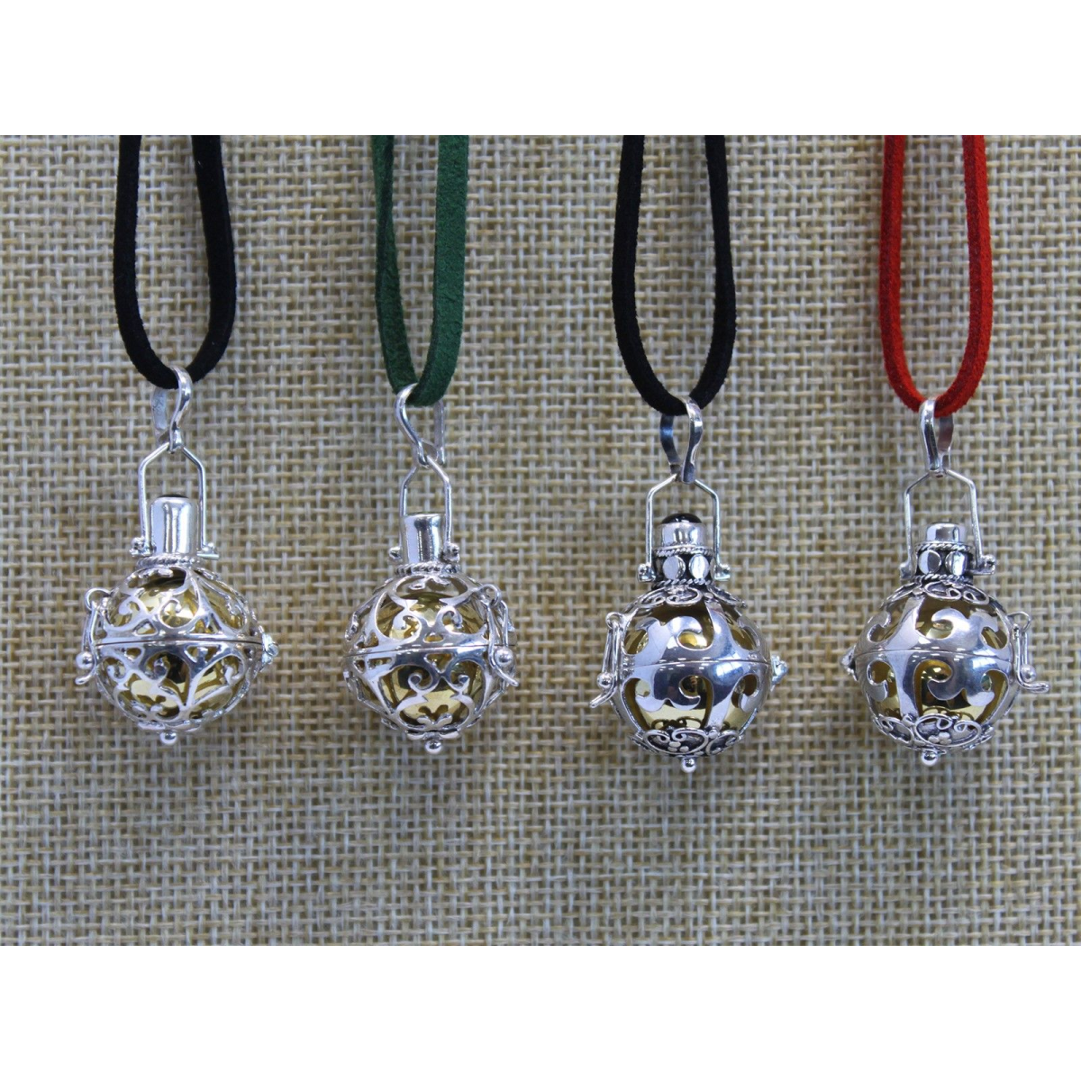 A gift of a silver angel bell, is truly a gift from the heart. Artisan made from Bali 92.5 silver. Neck cords also with silver detail and clasps. Bells are balanced brass or ceramic and resin