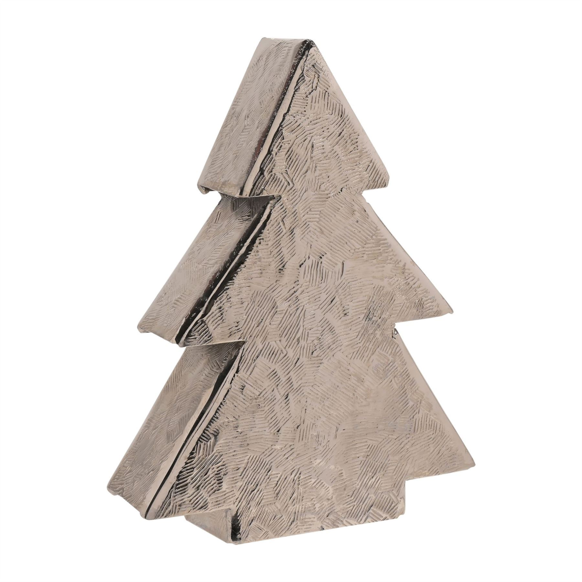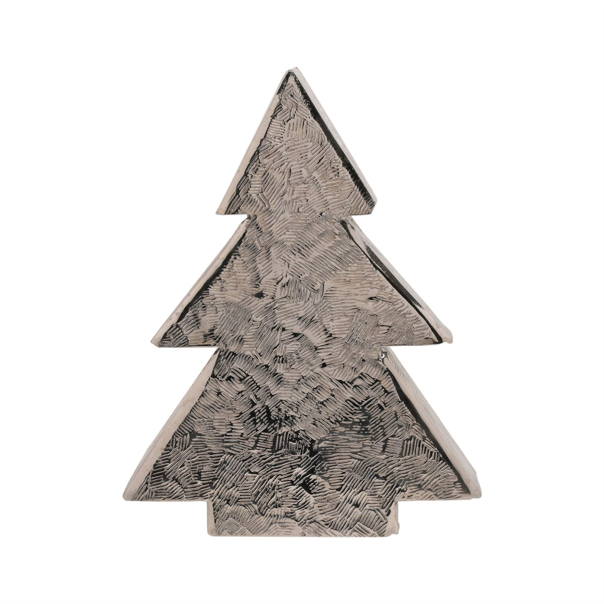 The silver metal ornament showcases a distinctive Christmas tree design, complete with hammered effect texturing. It brightens up living spaces on winter evenings with its metallic effect finish.