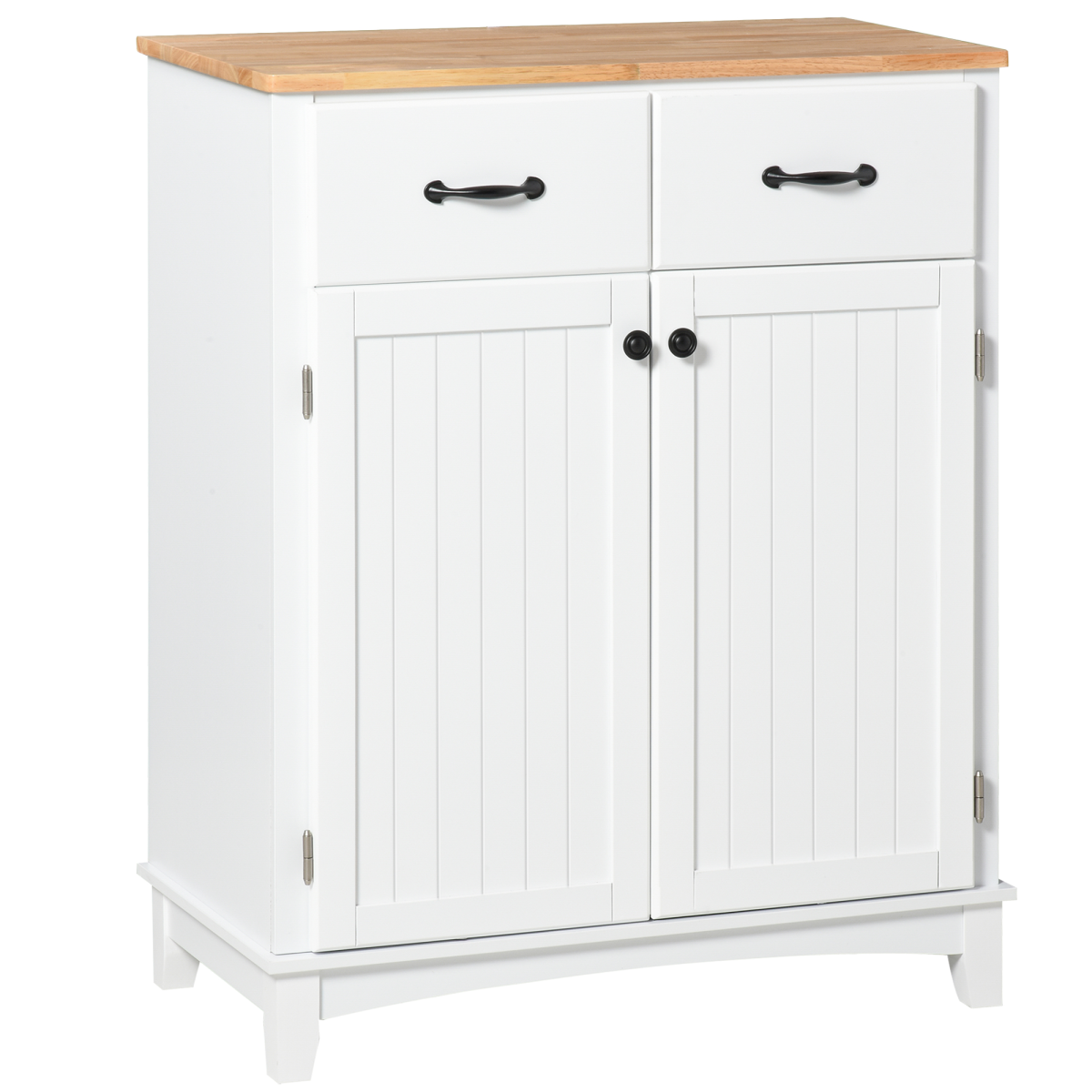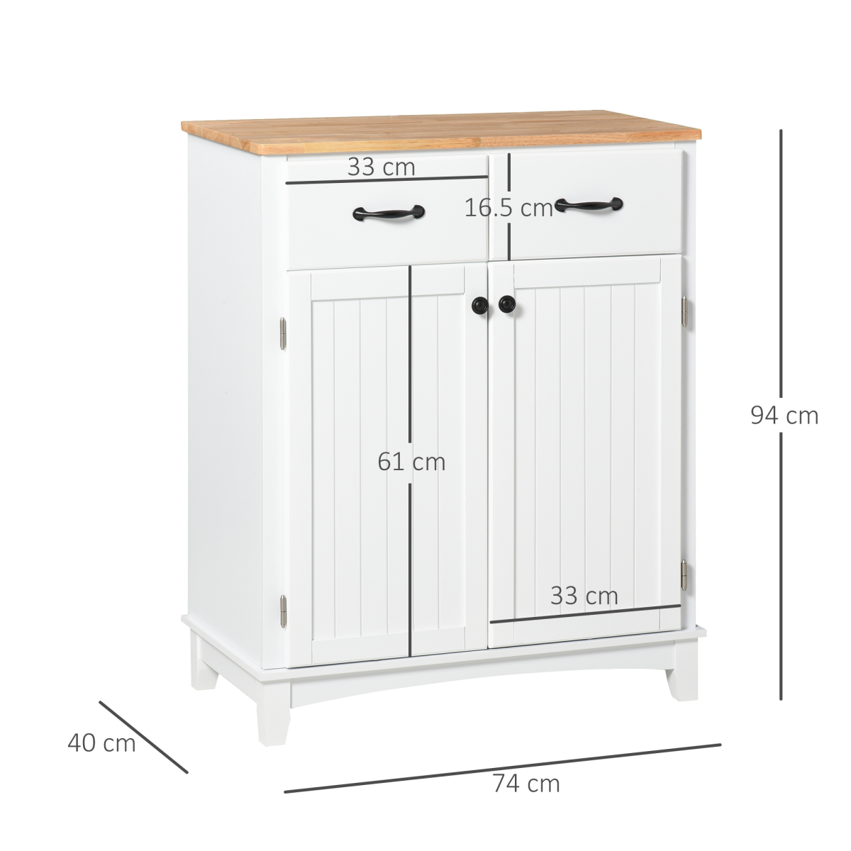 STORAGE: Two drawers and bottom cabinet, loads of space for crockery, utensils, glasses, food and more. Adjustable shelf moves up and down.WOODEN COUNTERTOP: Complements the white frame for a modern look - a solid holding and display place.STURDY: MDF structure is durable and sturdy, with anti-tipping design for extra stability and safety.DIMENSIONS: 94H x 74L x 40Wcm. Drawer inner: 10.5H x 27W x 28.5Dcm. Cabinet inner: 60H x 69.5W x 36.5Dcm.MAXIMUM LOAD 50KG. ASSEMBLY REQUIRED.