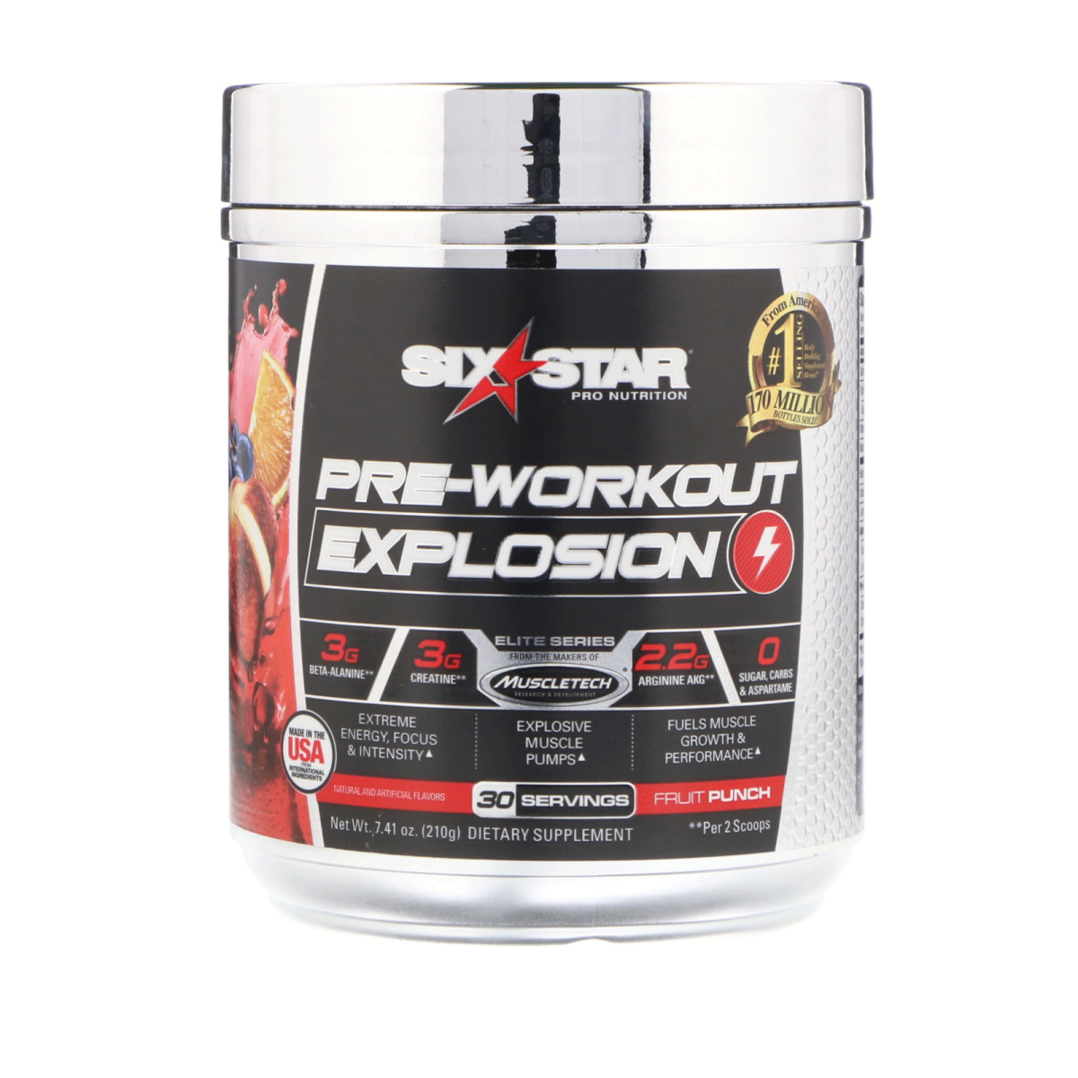 Contains Clinically Studied Ingredients Pro Nutrition From America's #1 Selling Body Building Brand‡ - 170 Million Bottles Sold! Elite Series – from the Makers of Muscletech - Research & Development 3 g Beta-Alanine** 3 g Creatine** 2.2 g Arginine AKG** 0 Sugars, Carbs & Aspartame Made in the USA From International Ingredients Extreme Energy, Focus & Intensity Explosive Muscle Pumps Fuels Muscle Growth & Performance Natural and Artificial Flavors 30 Servings Dietary Supplement 20 Years of Excellence Guaranteed Banned Substance Tested cGMP Manufactured - Manufactured According to cGMP Standards, as Required for all Dietary Supplements Six Star Pre-Workout Explosion Is Engineered For All Athletes Six Star Pre-Workout Explosion is from the makers of MuscleTech, America's #1 Selling Body Building Supplement Brand, so you know it's a powerful formula you can trust. Whether it's your first time at the gym or you're a seasoned vet, pro athlete or just trying to gain that extra edge in your sport, everyone is an athlete, and every athlete needs to fuel their body with the best sports nutrition products available. Delivering sought-after pre-workout ingredients and the most studied form of creatine for increased strength and performance, Six Star Pre-Workout Explosion is the fuel you want before you workout for extreme energy, focus and intensity, and it's Engineered for All Athletes. Six Star Pre-Workout Explosion Is For: Active Men & Women Strength Trainers All Athletes Fitness Enthusiast Body Builders Benefits of Six Star Pre-Workout Explosion: Boosts energy with a powerful dose of caffeine. Caffeine anhydrous enhances mental focus & workout intensity. Delivers arginine AKG, a unique form of arginine. Delivers powerful muscle pumps. Increases muscle carnosine levels to buffer lactic acid & support muscle endurance. Zero sugar. Zero aspartame. Amazing taste! Clinically Proven Ingredient for More Size and Strength Not only does Six Star Pre-Workout Explosion deliver more energy, enhanced focus and incredible muscle pumps for best workouts, it also delivers the most clinically studied form of creatine for more size, strength and performance. In just one study on 31 weight-trained test subjects randomly assigned to one of three groups, subjects consuming this same form of creatine significantly increased their strength capacity on the bench press by 18.6% compared to the baseline (6,658 vs. 5,613 joules) in just 10 days! Trust Six Star Pre-Workout Explosion for the best workouts of your life! ‡MuscleTech is America's #1 Selling Body Building Supplement Brand based on cumulative wholesale dollar sales 2001 to present. Over 170 million bottles of MuscleTech and Six Star products combined have been sold. **Per 2 Scoops.
