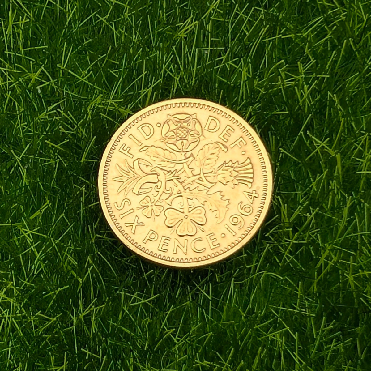 This golf ball marker has been made using a Sixpence. The design shows the four emblems of the United Kingdom, the rose, leek, thistle and shamrock.