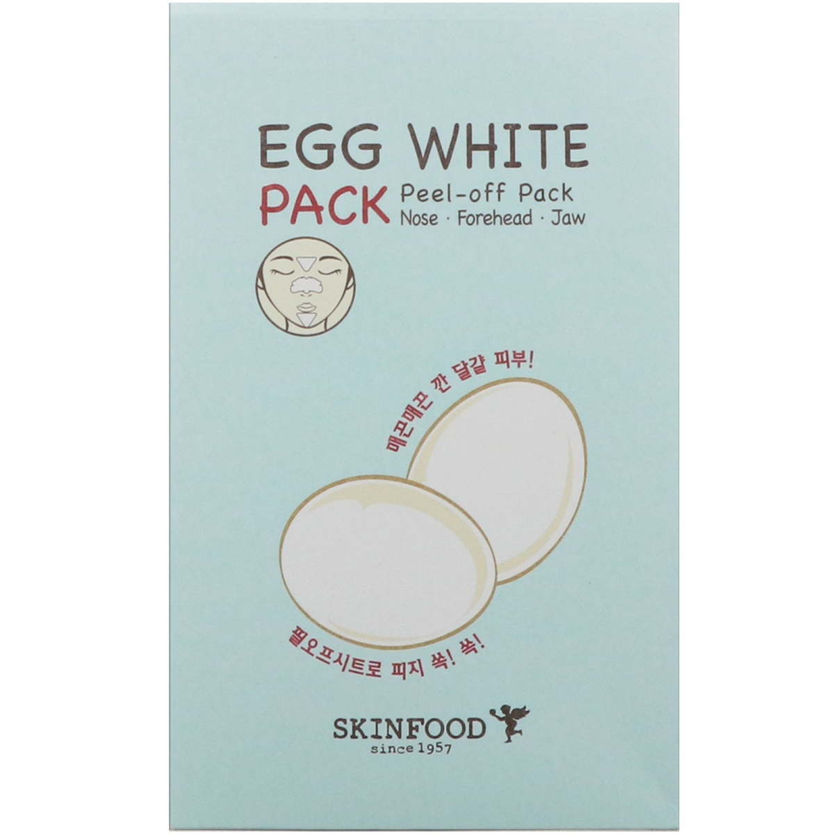 Since 1957 Skinfood Egg White Pack (Peel-off Pack for Nose - Forehead - Jaw) Rich egg-white extracts exfoliates and refines pores while controlling sebum secretion. Peel-off pack effectively eliminates annoying blackheads on the nose, forehead and chin. Use once to twice weekly to maintain visibly smaller pores that are blackhead free!