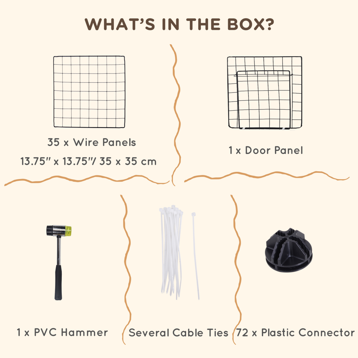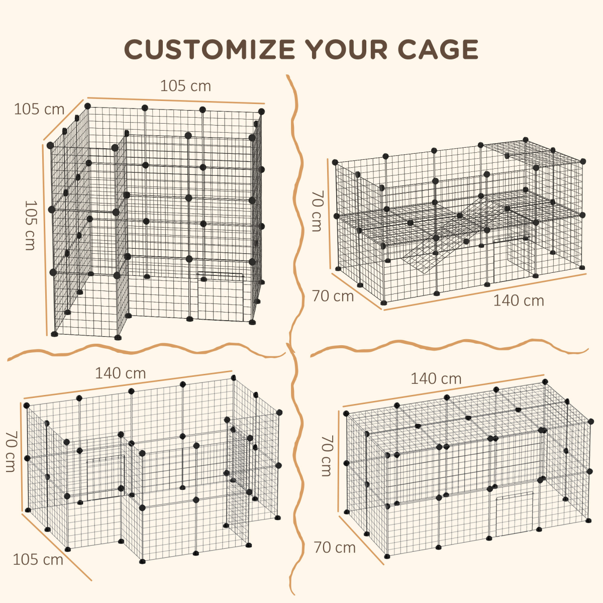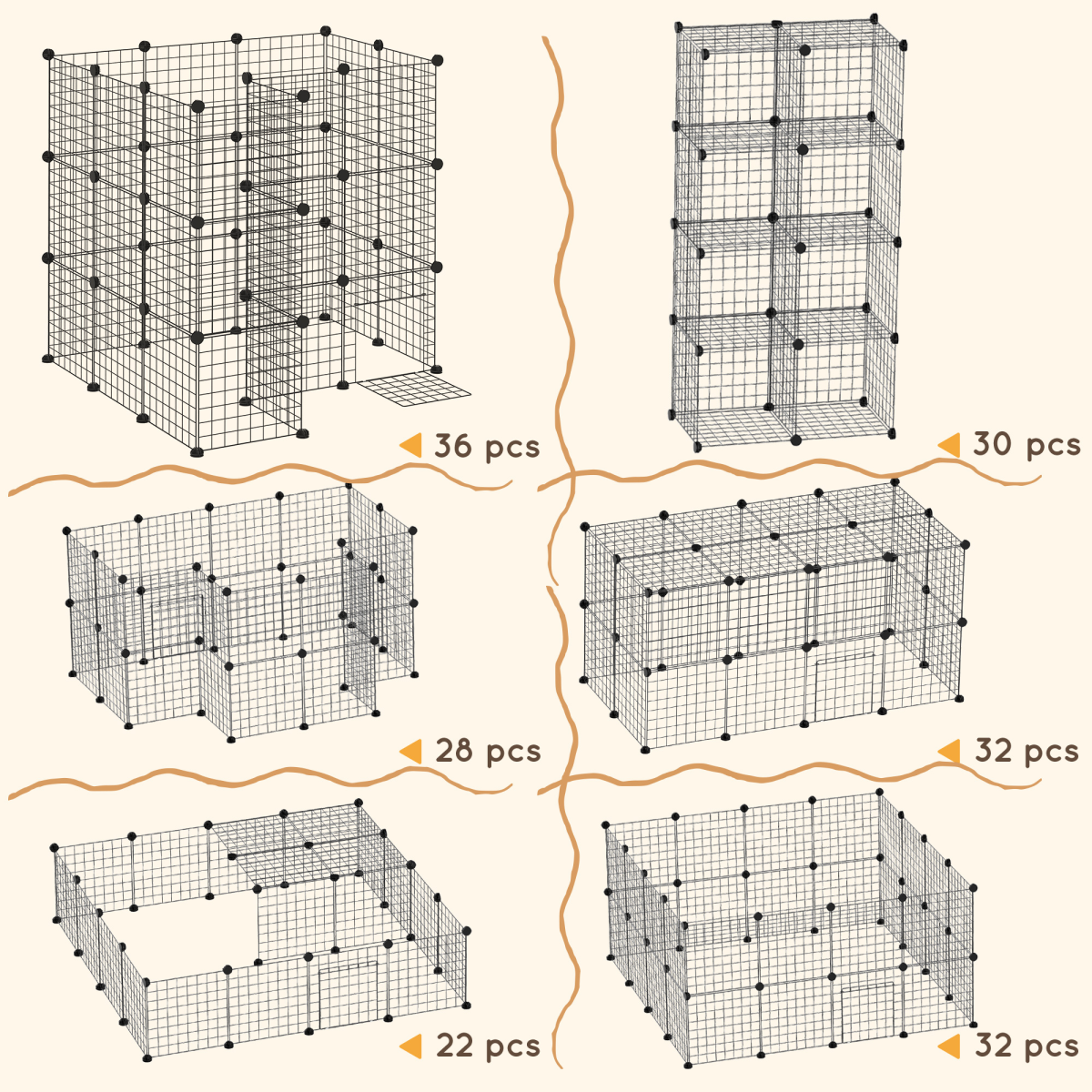 - Chinchilla cage is formed of 36 panels, allowing you to set it to any shape and size required - Made from metal for strength to safeguard, wire design allows air to circulate and helps stop the feeling of being trapped - Built-in door provides easy access in and out - Rounded corners for safety - Mallet, connectors and cable ties included - Suitable for small pets