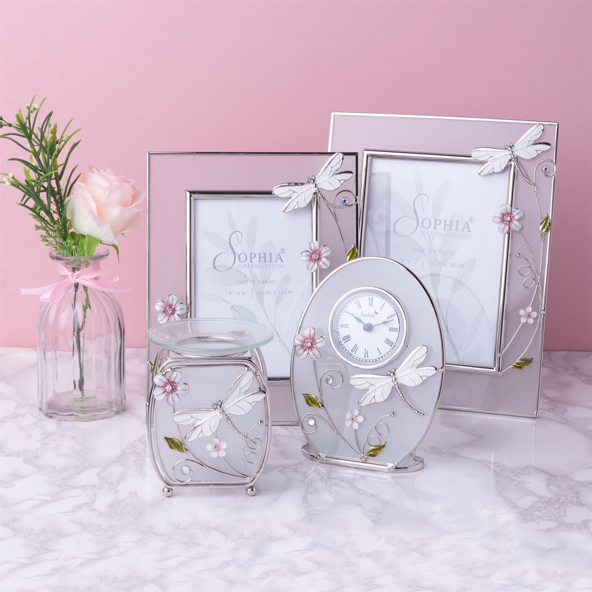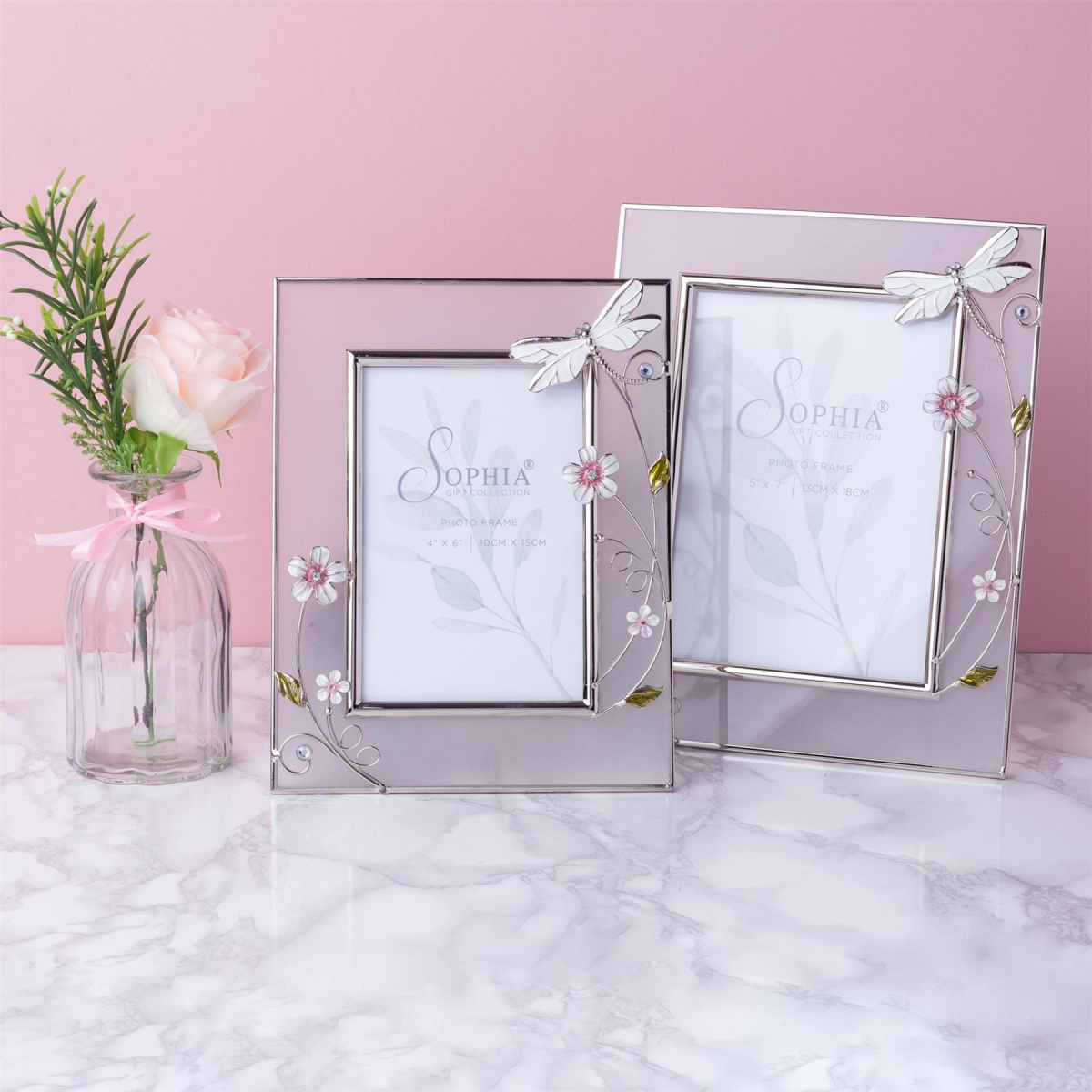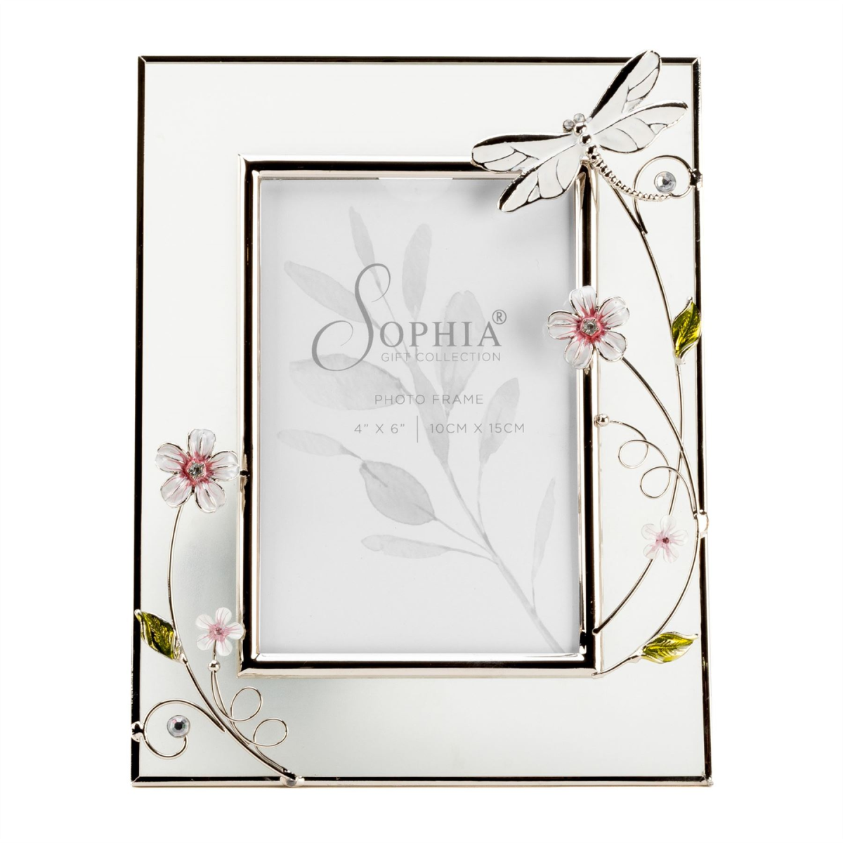 A delightful frosted glass and metal wire dragonfly photo frame with colourful enamel. From SOPHIA� - the home of sophistication in women's giftware. Details: - Hand painted colourful enamel - Silver metal framework and frosted glass panel - Dragonfly & floral details - Clear crystal details - 4" x 6" (10x15cm) aperture - Portrait or landscape - Black velveteen standing strut Part of a gorgeous matching series of accessories.