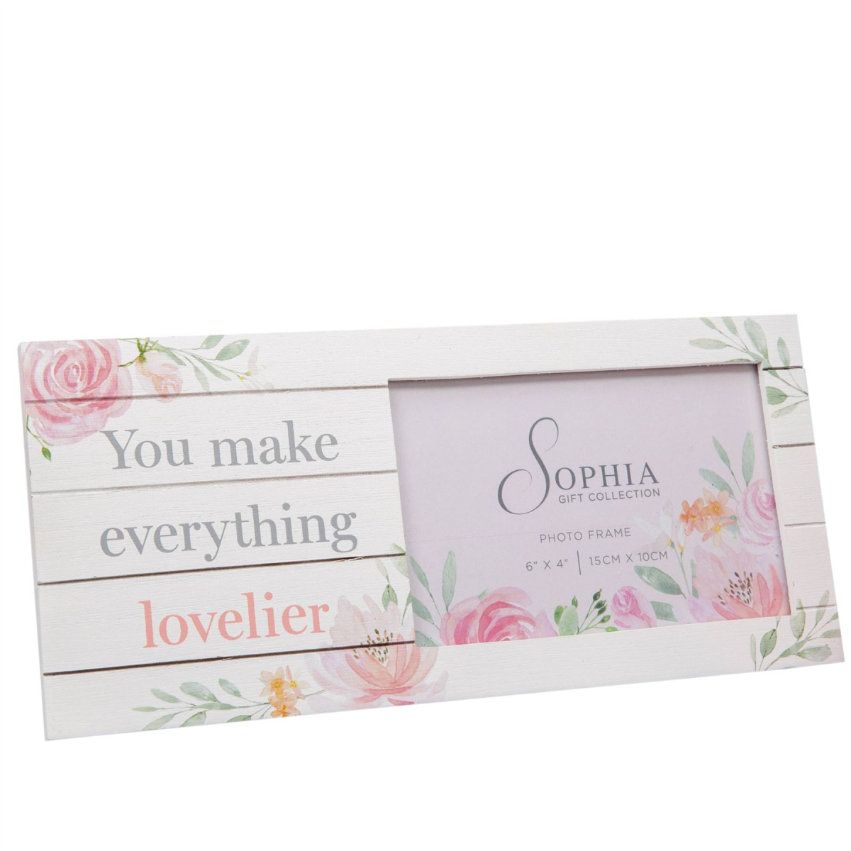 Give a precious photo of someone truly special its place to shine with this beautiful floral photo frame. From SOPHIA� - the home of style & sophistication in women's giftware. Details: - White wood plank finish frame - Pink and green watercolour floral illustrations - YOU MAKE EVERYTHING LOVELIER title - 6" x 4" landscape aperture - Standing strut - Gift box A wonderful and heartfelt Mother's Day or birthday gift.