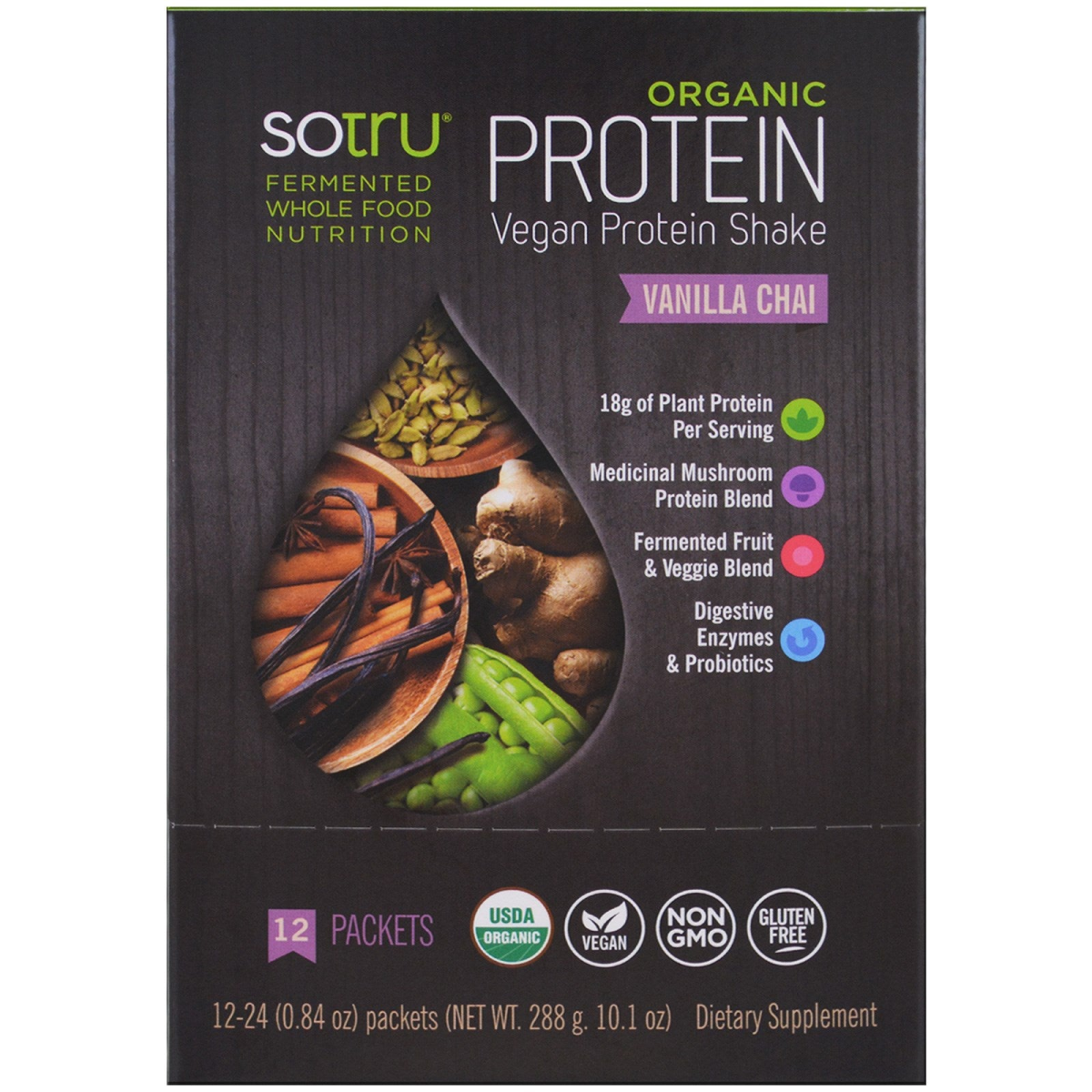 - Whole Food Rich Creamy Taste 18 Gram Protein - Serving Fermented Whole Food Nutrition 18 g of Plant Protein Per Serving Medicinal Mushroom Protein Blend Fermented Fruit & Veggie Blend Digestive Enzymes & Probiotics USDA Vegan Non GMO Gluten Free Dietary Supplement Certified by Quality Assurance International SoTru At SoTru, we source the finest whole superfoods on the planet, then unlock the plants' full nutritional potency using the ancient art of fermentation, creating the most easily digestible and bioavailable products possible for your optimal health and vitality. SoTru Protein was formulated to provide an exceptional, source of vegan protein blended from Peas, Amaranth, Quinoa and Medicinal Mushrooms to support your healthful, active lifestyle. Great -tasting, Vanilla Chai flavor. Proprietary SoTru vegan protein blend Well balance Amino Acid Profile 18 grams of hypoallergenic plant-based protein Promotes Energy and Satiety Supports athletic recovery and muscular development Supports ideal body composition and healthy weight management Digestive enzymes and a stable probiotics for optimal gut health Dairy-Free, Soy-Free, Gluten-Free Only 100 calories per serving So Simple. So Good. SoTru.