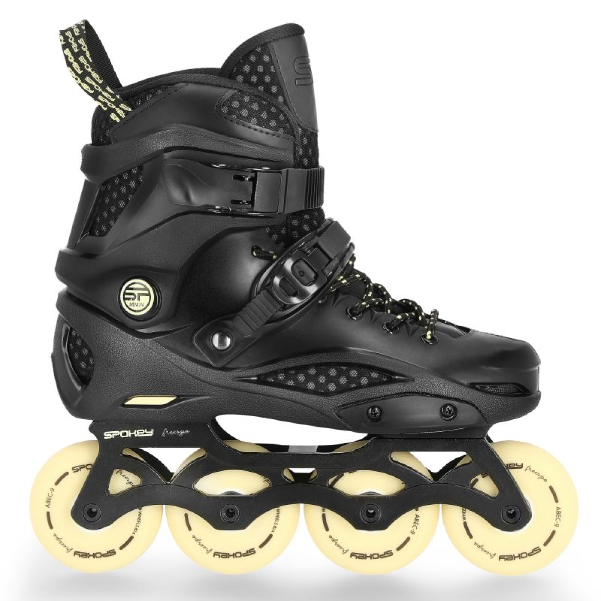 Freespo is a skate that both advanced riders and beginners will appreciate. It will work well in recreational skating, slalom or freestyle in the city or skatepark. A very important element of our skates is the runner. In Freespo, it was made of aluminum using a special CNC technique, which results in maintaining a very low weight of the model and exceptional durability of this element. FREESPO has been equipped with PUC wheels, i.e. cast polyurethane with a hardness optimal for both recreational and dynamic, freestyle (85A) skating. To facilitate body balancing and increase maneuverability while skating, in the FREESPO model we have used different wheel sizes depending on the selected size: size 36-39 - 76×24 mm wheels, size 40-45 - 80×24 mm wheels. The culmination of the quality of Spokey FREESPO skates are ABEC9 Chrome bearings, which, thanks to the highest precision of workmanship, ensure excellent durability and allow you to develop high speeds. They are also equipped with ANTISHOCK, a heel insert that absorbs vibrations when jumping and riding on difficult surfaces (e.g. cobblestones). All this means that with FREESPO you will feel maximum comfort while riding.