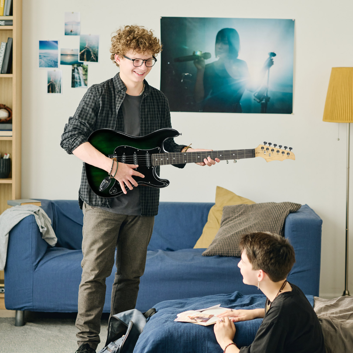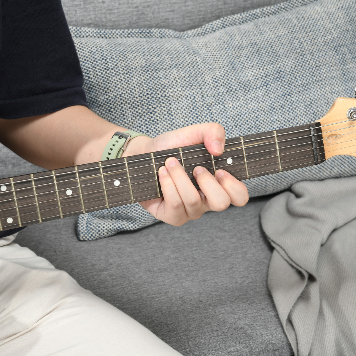 - Three single-coil pickups, a volume control knob and a tone control knob on the body - Comes with amplifier, carry bag, shoulder strap, three picks, digital tuner, capo, spare strings, wrench, cleaning cloth and 3 metre connecting cable - 15W Amplifier with built-in speaker, volume control, tone control and phone jack - The body is painted and polished to present a mysterious outlook - Tuning with the tuning pegs and the digital tuner