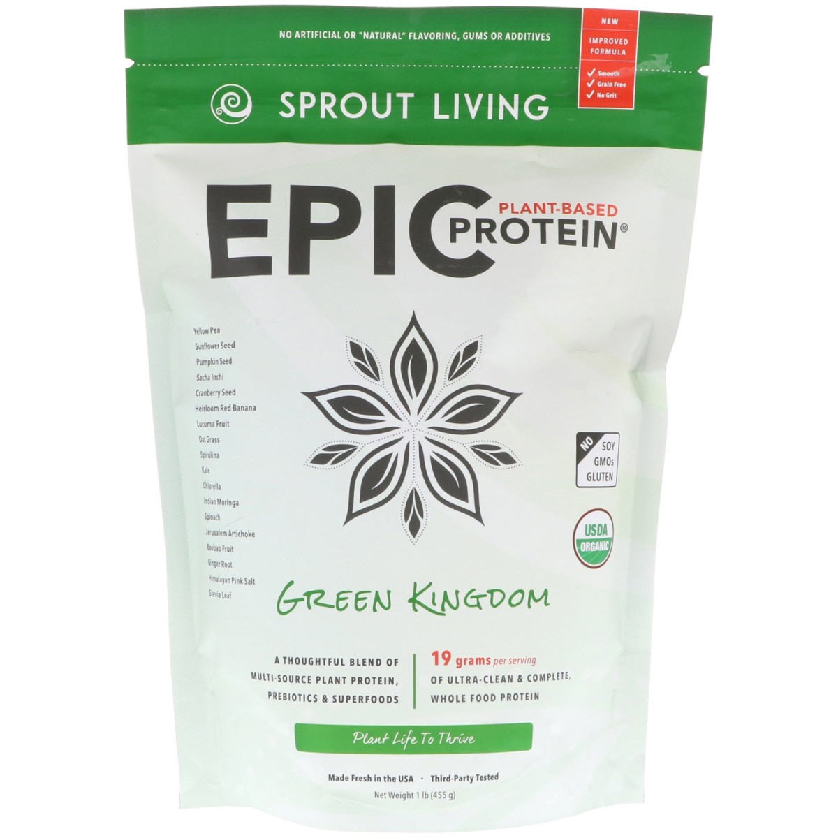 No Artificial or "Natural" Flavoring, Gums or Additives Improved Formula - Smooth, Grain Free, No Grit Yellow Pea Sunflower Seed Pumpkin Seed Sacha Inchi Cranberry Seed Heirloom Red Banana Lucuma Fruit Oat Grass Spirulina Kale Chocolate Indian Moringa Spinach Jerusalem Artichoke Baobab Fruit Ginger Root Himalayan Pink Salt Stevia Leaf No Soy, GMO, Gluten USDA Organic A Thoughtful Blend of Multi-Source Plant Protein, Prebiotics & Superfoods 19 Grams Per Serving of Ultra Clean & Complete, Whole Food Protein Plant Life to Thrive Third-Party Tested Tastes Real Because It Is Farm Sourced - Optimally Dried - Thoughtfully Formulated - For Your Enjoyment Vegan Gluten Free Raw Nut Free Kosher Certified Organic by QAI Certified Kosher and Vegan By EarthKosher Naturally Gluten Free, but Not Certified Life. Better. Real. Epic Protein: Green Kingdom is a thoughtful blend of complete organic plant proteins and nutrient-dense, exotic superfoods. With bursts of sweet greens flavor and hints of citrus, it's a smooth and delicious protein powder fit for your healthy lifestyle! Multi-Source Protein With Whole Superfoods Yellow Pea • Sunflower Seed • Pumpkin Seed • Sacha Inchi • Cranberry Seed • Heirloom Red Banana • Lucuma Fruit • Oat Grass • Spirulina • Kale • Chlorella • Indian Moringa • Spinach • Jerusalem Artichoke • Baobab Fruit • Ginger Root • Himalayan Pink Salt • Stevia Leaf Our EPIC Blend is an evolution of how we understand protein and its connection to the body. Protein-packed yellow pea, vitamin-rich sunflower seed, fatty acid boasting pumpkin seed and sacha inchi, antioxidant-rich cranberry seeds and prebiotic-supplying Jerusalem artichoke create a full spectrum, complete plant protein that helps speed up recovery time, promote strength and replenish your body after a fun or challenging workout. More than just a great source of protein, it's the dynamic combination of powerful nutrients from whole superfoods that makes Epic Protein so special. Spirulina is an antioxidant-rich, immune-boosting blue-green algae that supplies protein, chlorophyll and vitamins A, K and B, including critical vitamin B12. Kale, which is high in vitamins A, C and K, is an iron- rich powerful dark green leafy vegetable that is also high in fiber and low in calories. Indian Moringa, or the "Clarifier Tree" is incredibly nutritious, anti-inflammatory plant that makes high levels of calcium, protein and vitamins A, B and C.