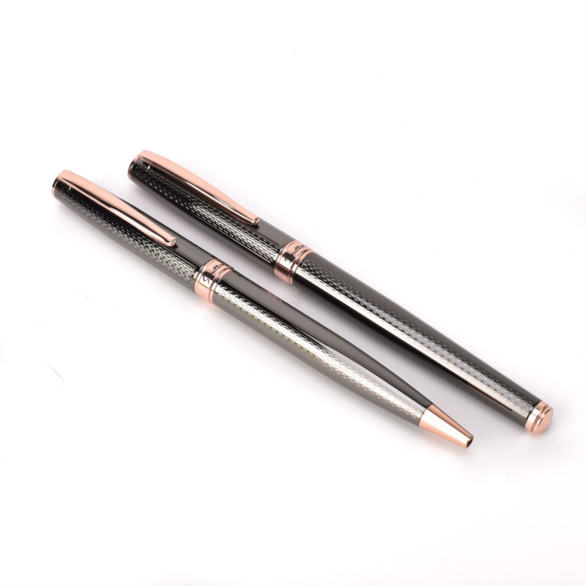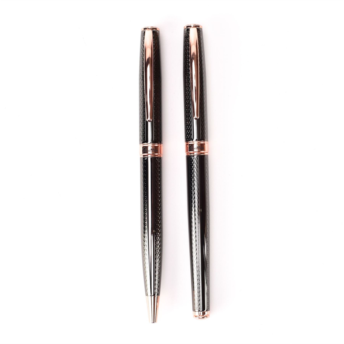 A stylish polished black metal and rose gold ballpoint and rollerball pens set. From Stratton Pens - 120 years of prestige, a lifetime of precision.