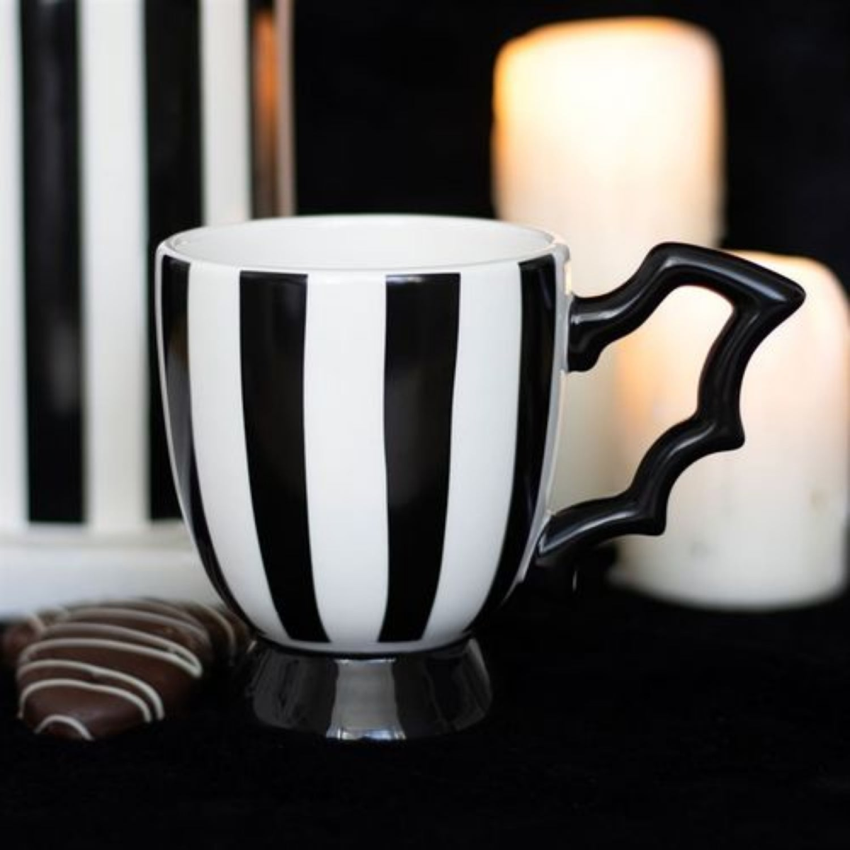 Take teatime to new heights with this eerily elegant tea cup with a bold bat wing handle. Designed in timeless monochrome stripes, this picture perfect piece is sure to your socials in a spin. Handwash only. 490ml.