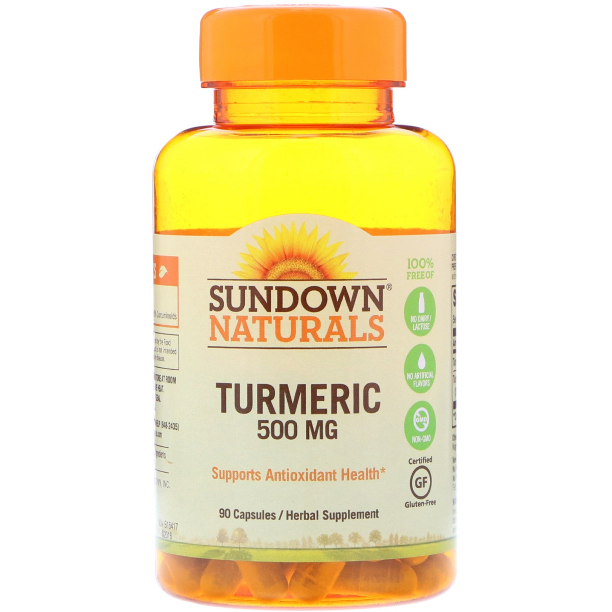 Supports Antioxidant Health Herbal Supplement 100% Free Of No Dairy/Lactose No Artificial Flavors Non-GMO Certified Gluten-Free Smart Facts No Artificial Colors No Preservatives Contains 500 mg Extract Standardized for 95% Curcuminoids