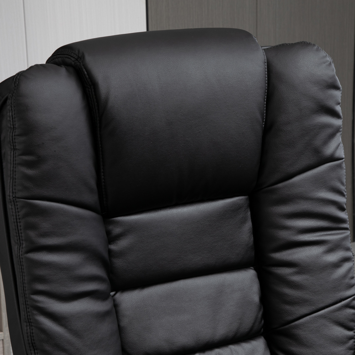 - "Swivel Manual Recliner and Footrest Set PU Lounge Chair Wood Base, Black" - Description: - 135° manual recliner: Simply press the button on this living room chair and lean back - great recliner armchair for whenever you want to switch off - use with the included footrest for added relaxation. - Comfortable: The single chair and stool are filled with thick sponge all over - simply sink in, legs up and relax. Armrests and a tall back to support body. - Faux leather armchair and footstool duo: A seating set which is super stylish and smooth to touch - brings an upmarket and executive feel into your home/office space. - Wooden bases: Strong and supportive, polished finish is beautiful. - Dimensions: - Chair upright: 102H x 79W x 80Dcm. - Chair reclined: 94H x 79W x 106Dcm. - Stool: 40H x 50W x 47Dcm. - Maximum load 130kg. - Assembly required.