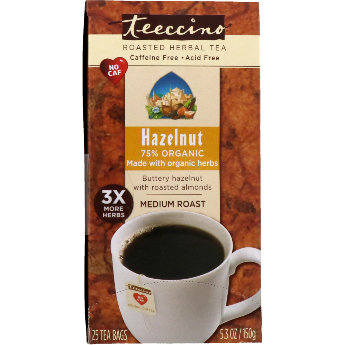 Acid Free 75% Organic Made with Organic Herbs Buttery Hazelnut with Roasted Almonds 3X More Herbs Certified Organic by Quality Assurance International QAI Kosher Parve Non Irradiated, Non-GMO The Rich and Roasted Herbal Tea Whether you're a tea or coffee drinker, you'll love Teeccino's satisfying, robust flavor that fans describe as smoother, richer, and creamier than coffee. The secret? French chicory, the roasted root often added to coffee, blended with barley, Italy's favorite caffeine-free roasted brew, and Spanish carob, famed for its chocolaty flavor. Enriched with California's almonds, dates, and figs, Teeccino makes a delicious cup of tea... or is it coffee? We'll let you decide! 100% natural caffeine-free Natural energy boost - from nutrients, not stimulants Acid free - helps restore alkaline balance Heart-healthy potassium - for optimal performance Inulin - A prebiotic soluble fiber that feeds your gut flora to improve digestion, elimination and support the immune system Innovative Tea Bags = Bold Flavor 3 times more product than regular tea bags: 6 g tea bags for a full-bodied flavor Convenient, single serve bags, individually wrapped Fresh brewed flavor is superior to instant beverages About gluten: Independent laboratory tests can not detect gluten in brewed Teeccino when using a paper filter on Tee-bag. For certified gluten-free herbal teas, drink Teeccino Dandelion flavors.