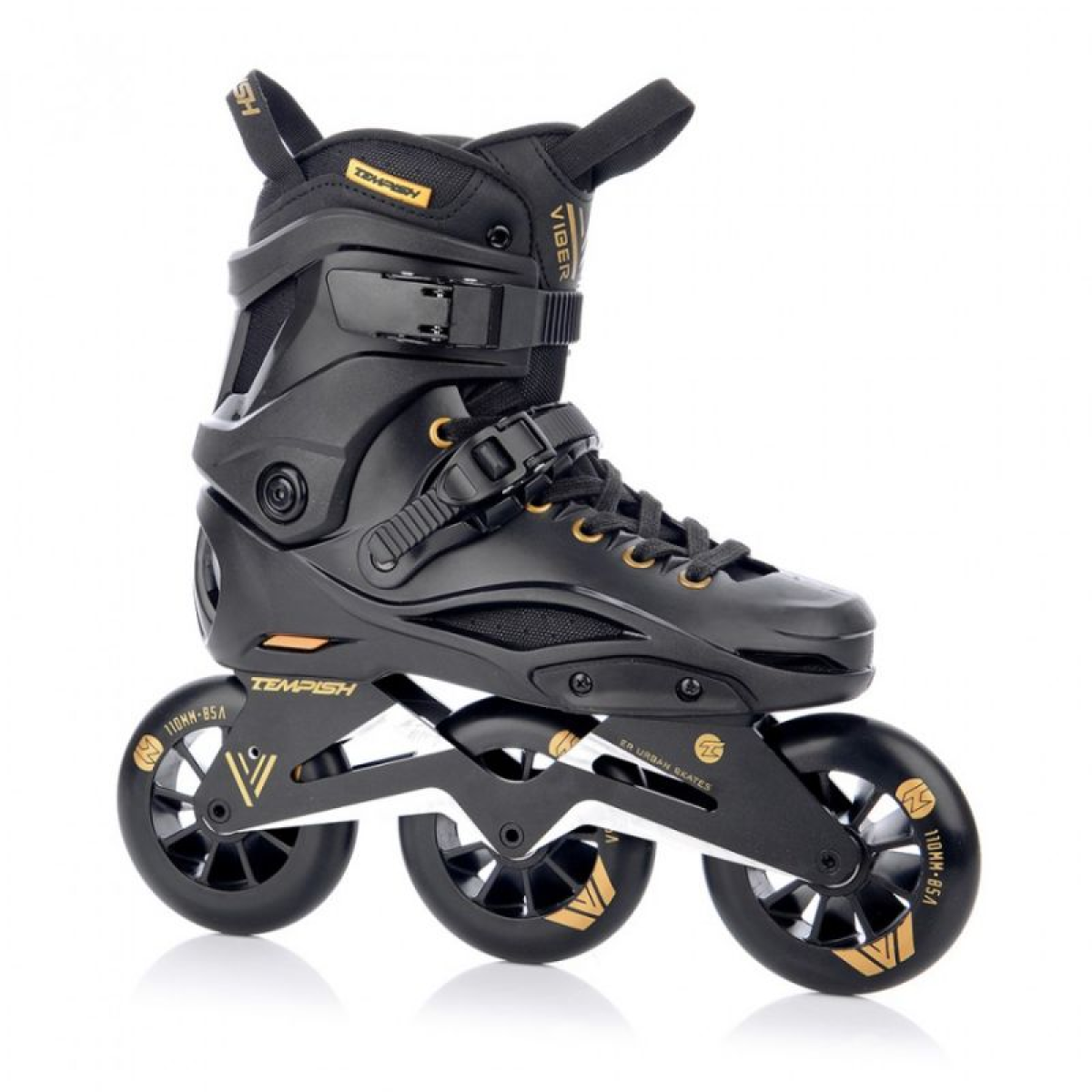 TEMPISH VIBER LE 110 Freeskate skates a hard boot and fast large 110 mm wheels are the perfect combination. Skates designed for both shorter city rides and long trail trips. These skates are perfect for advanced and experienced skaters. Thanks to high-quality materials and carefully crafted, these skates provide not only excellent performance, but also maximum comfort and safety during every ride. Main features: Boot: Made of a hard, composite material, providing a strong foot hold and stability while riding. It has a ventilated insole that allows air circulation and comfort. Fastening: Equipped with a metal self-locking buckle and a micro buckle system on the instep strap, ensuring a precise and comfortable fit. Chassis/rail: Heavily reinforced chassis made by CNC with the possibility of transverse and longitudinal adjustment, and screws mounted on solid aluminum blocks. Wheels: Three 110 mm diameter wheels ensure high speed and stability. Made of PUC, with a hardness of 85A, they offer excellent grip and durability. Bearings: High quality chrome ABEC-9 with rubber cover for easy cleaning and maintenance. Customization: Possible replacement of plastic external protectors and instep belt. It is possible to mount smaller wheels in the chassis (minimum recommended size 90 mm). Liner: Ventilated liner with neoprene toe area for increased comfort. Elastic loop on the tongue makes it easy to put on. The TEMPISH VIBER LE 110 skates are an excellent choice for advanced skaters looking for a combination of durability, stability and speed. Their solid construction, innovative solutions technological and personalization options make them suitable for both urban escapades and long routes on trails. TECHNICAL PARAMETERS Intended use Street (urban) and freestyle riding, advanced and experienced riders. NC frame additionally reinforced, one-piece, adjustable transversely and longitudinally Wheel size 110 mm Wheel hardness 85A Bearings 608, ABEC 9 FitGo lacing system Type | Shoe shell Hard composite Liner (inner sock) Thin nylon, absorbent microfiber. Under the lining in the heel part, shock-absorbing quiet The block is made of TPR material, which perfectly absorbs vibrations and shocks, is quite thick, soft and comfortable. Brake None Top fastening Buckle 45-degree fastening Buckle Axles 6mm Weight limit 100 kg