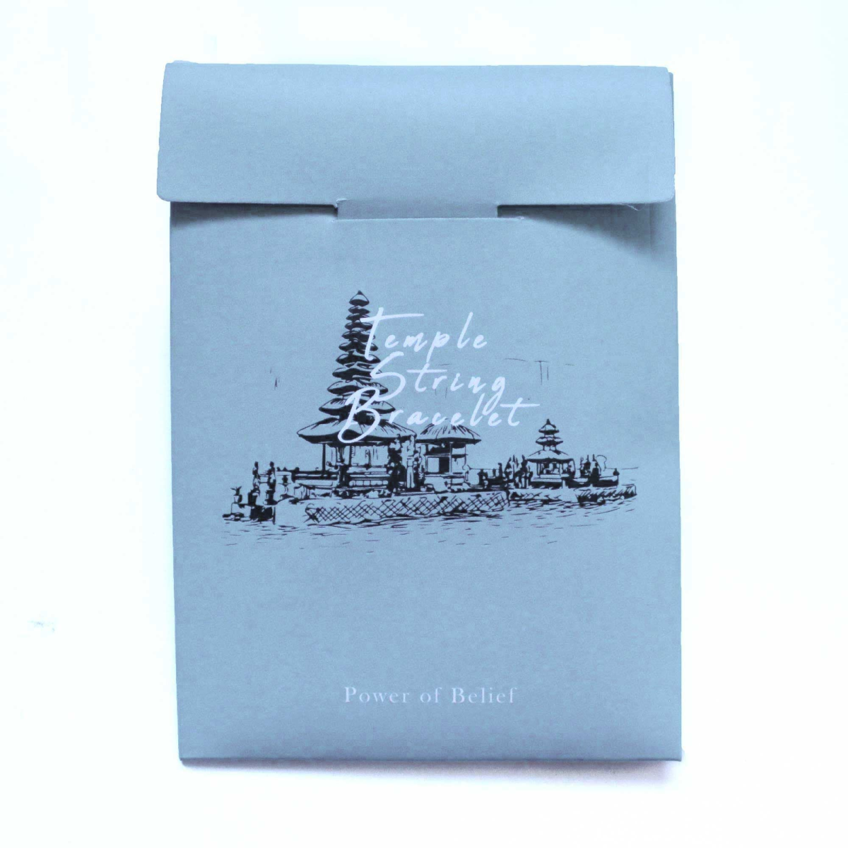 Each Temple String Bracelet - Power of Belief is packed in a blue paper bag with a short description of its intention: