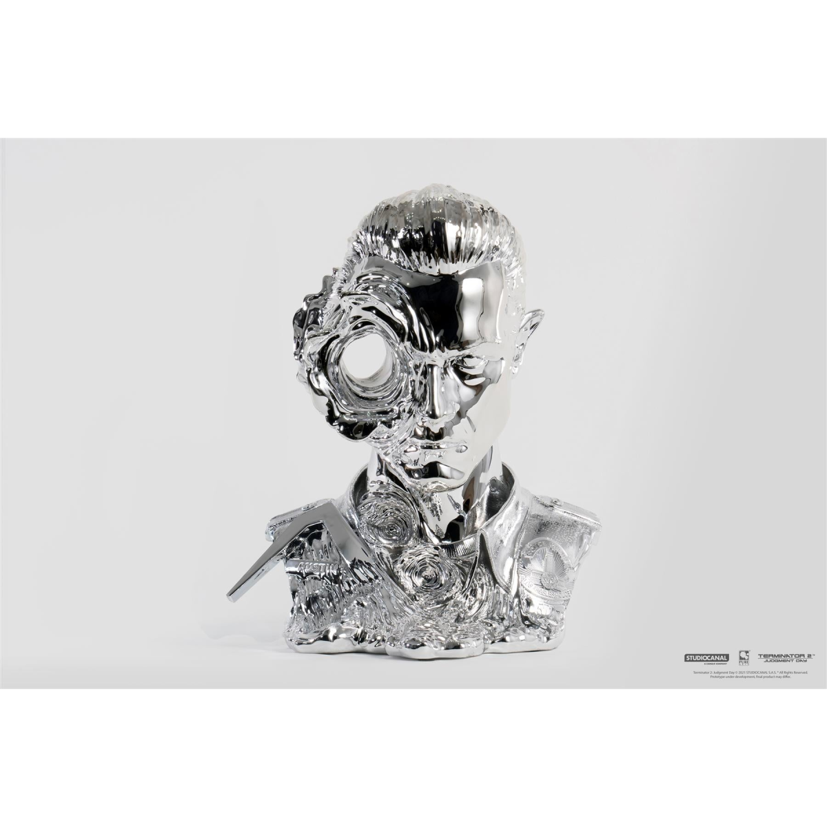 "Not like me. A T-1000, advanced prototype. A mimetic poly-alloy. Liquid metal." Featuring a liquid molecular brain, the ability to shape-change and mimic objects and beings of similar size, Skynet's T-1000 is the ultimate killing machine. Portrayed by the iconic Robert Patrick, PureArts brings the T-1000 to life in our 1:1 scale Art Mask series! Just before the T-1000's shape change completes, the reflective liquid metal surface is visible, leaving you mere seconds to flee or die. Available in a Standard Edition. Product highlights: Base can be desk or wall mounted Complete Electro-plated chrome finish Regular Edition size: 1000 units Product features: Licensed by Studio Canal Scale: 1:1 Material: Polyresin Product Information: Qty: 1 replica mask (non-wearable) Height: 17 in (44 cm) Width: 14 in (36 cm) Depth: 11 in (29 cm) Weight: 15.5 lbs (7 kg) Terminator 2: Judgment Day, T2, THE TERMINATOR, ENDOSKELETON, and any depiction of Endoskeleton are trademarks of STUDIOCANAL S.A.S. All Rights Reserved. 2021 STUDIOCANAL S.A.S. All Rights Reserved.