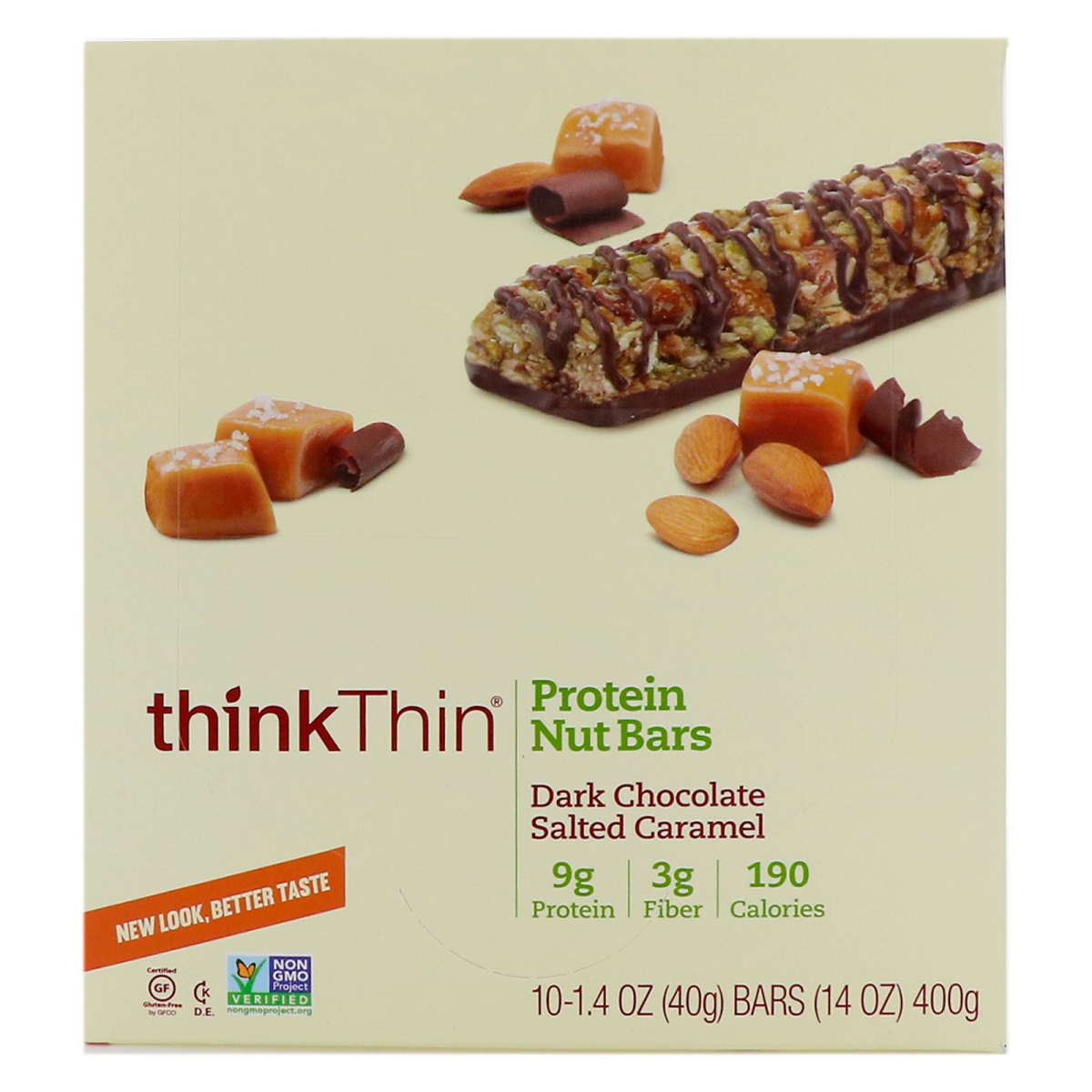 New Look. Better Taste. 9 g Protein | 3 g Fiber | 190 Calories Certified Gluten Free Kosher Dairy Non GMO Project Verified Forget the scales, measuring tapes, and guilt. I believe in eating well, living well and feeling great. That's why every wholesome and delicious thinkThin recipe is full of ingredients that give your body plenty of balanced nutrition and the energy to thinkPositive. To me, that's what it's all about. I know how hard it is to eat well when you're always on the go. That's why I created thinkThin Protein Nut Bars, loaded with 9 g of hunger-fighting protein and 3 g of fiber, all for 190 calories. Each Dark Chocolate Salted Caramel bar is chock-full of nutritious whole nuts and pumpkin seeds, flavored with salted caramel and drizzled in decadent chocolate. It's a perfect way to fuel up and fight cravings anytime, anywhere. To your vitality, Lizanne Founder of thinkThin