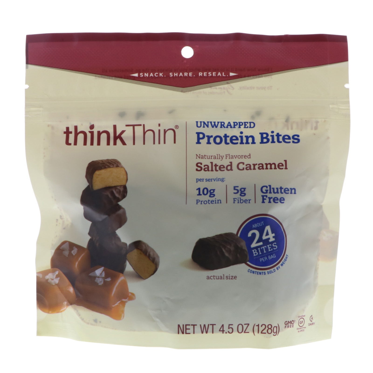 Snack - Share - Reseal Naturally Flavored Per Serving - 10 g Protein - 5 Fiber About 24 Bites Per Bag - Contents Sold by Weight GMO Free† Certified Gluten-Free by GFCO Kosher I know how hard it is to eat well when you're always on the go. Sometimes all you need is a delicious, little bite to help keep you happy, energized and satisfied. To your vitality, Lizanne Founder of thinkThin. Unwrapped Protein Bites Naturally Flavored Salted Caramel Snack smart and feel great with scrumptiously bite-sized and shareable thinkThin Protein Bites. Each serving of delicious Salted Caramel bites has 10 grams of protein, 5 grams of fiber, 170 calories - all wrapped in rich chocolate. These bite sized versions of your favorite thinkThin bars are perfect as a little treat, an on-the-go snack, or to share. †All ingredients have been produced without the use of genetic engineering.