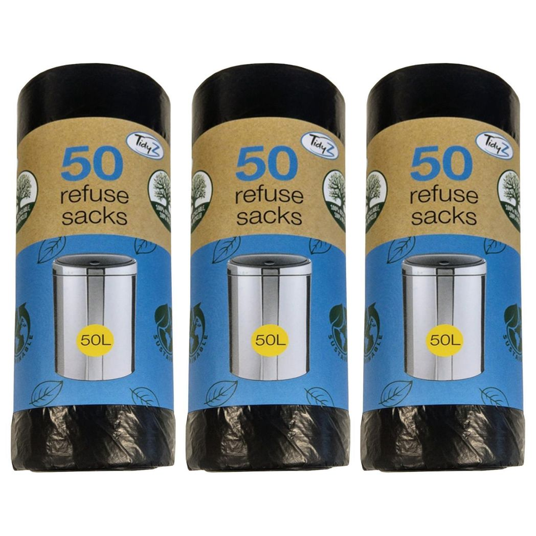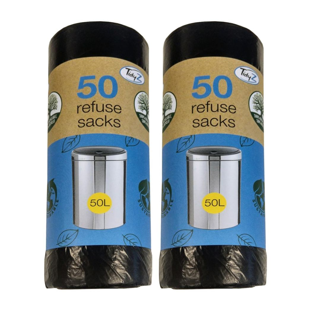 Tidyz Extra Strong Drawstring Refuse Sacks Bin Bags, Black,50L(Select Your Pack) Tidyz wheelie bin extra-strong liners thick and big black bags, ideal for general waste and outdoor bins. Come in 50L and suit most European trash bins. Large enough to hold a large piece of daily garbage. Strengthened build, heavy-duty, tough bottoms to hold heavy garbage. Friendly to environment, No plastic odour. Keep the air fresh and improve your health. Strong drawstring saves you the trouble of holding the bags with both hands. Smart fit for your waste bin no ugly overwrap, easier to insert and remove the bin liner. Perfect for use throughout the house, in the kitchen or office. These refuse sacks can hold up to 50 liters of waste and come with a handy drawstring closure allowing you to easily tie a knot in the top of the bag when it's full. These Black refuse sacks come in packs of 50 individual sacks. Due to the quality of our waste bin bags, they should never tear or split so rubbish will never come into contact with your bin. This means no nasty odours escaping from your refuse sacks. With capacity and the strength to hold up to 50L, our extra heavy duty bin bags are suitable for commercial use where the bags are being loaded with waste that could tear lower quality bags. Key Features : Made of strong quality plastic. Convenience and durable. Easy to insert neatly and to remove quickly. Very Strong, Thick, sturdy refuse sacks. Durable wheelie bin liners are perfect for domestic use. Product Specifications : Product Dimensions : 82x125cm(Circumference) Brand: Tidyz Material: Plastic Each Bin Liner Capacity: 50L Package Includes: Tidyz Extra Strong Drawstring Refuse Sacks Bin Bags, Black,50L(Select Your Pack)