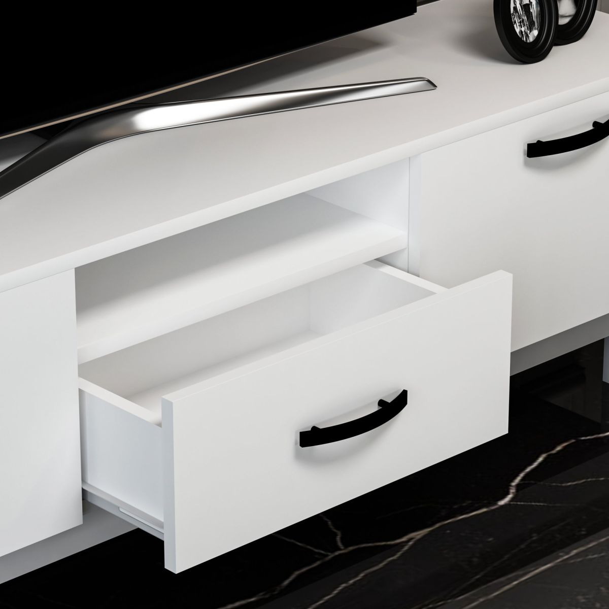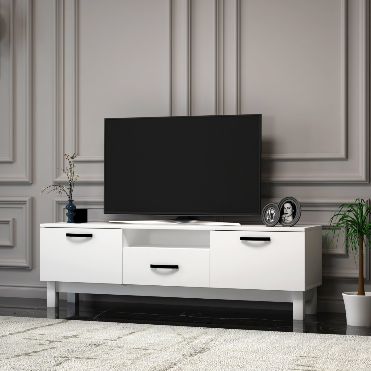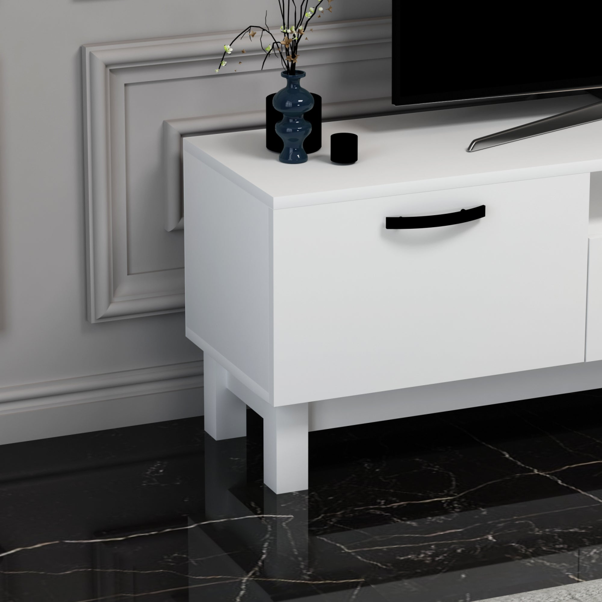MATERIAL: The TV Stand is made of an 18 mm thick quality melamine-coated particleboard. The manufactured wood surface is water-resistant to some extent and the edges are banded with PVC edge banding tape. Door handles are quality iron metal. First-class assembly/installation hardware and accessories are used. Our products are produced from certified quality raw materials that do not contain carcinogenic substances and comply with European Union health norms.