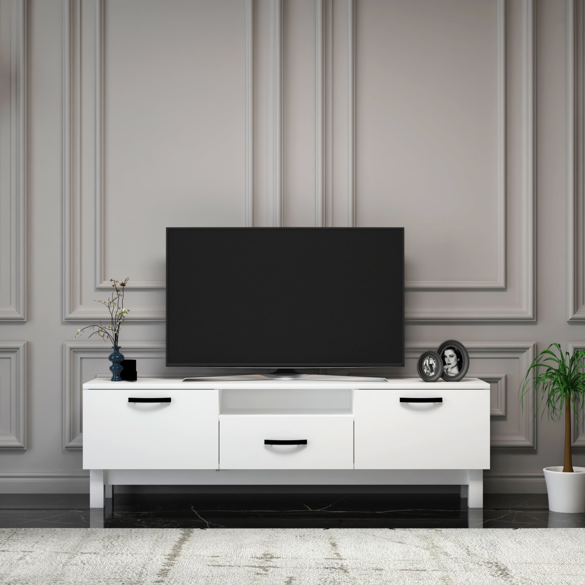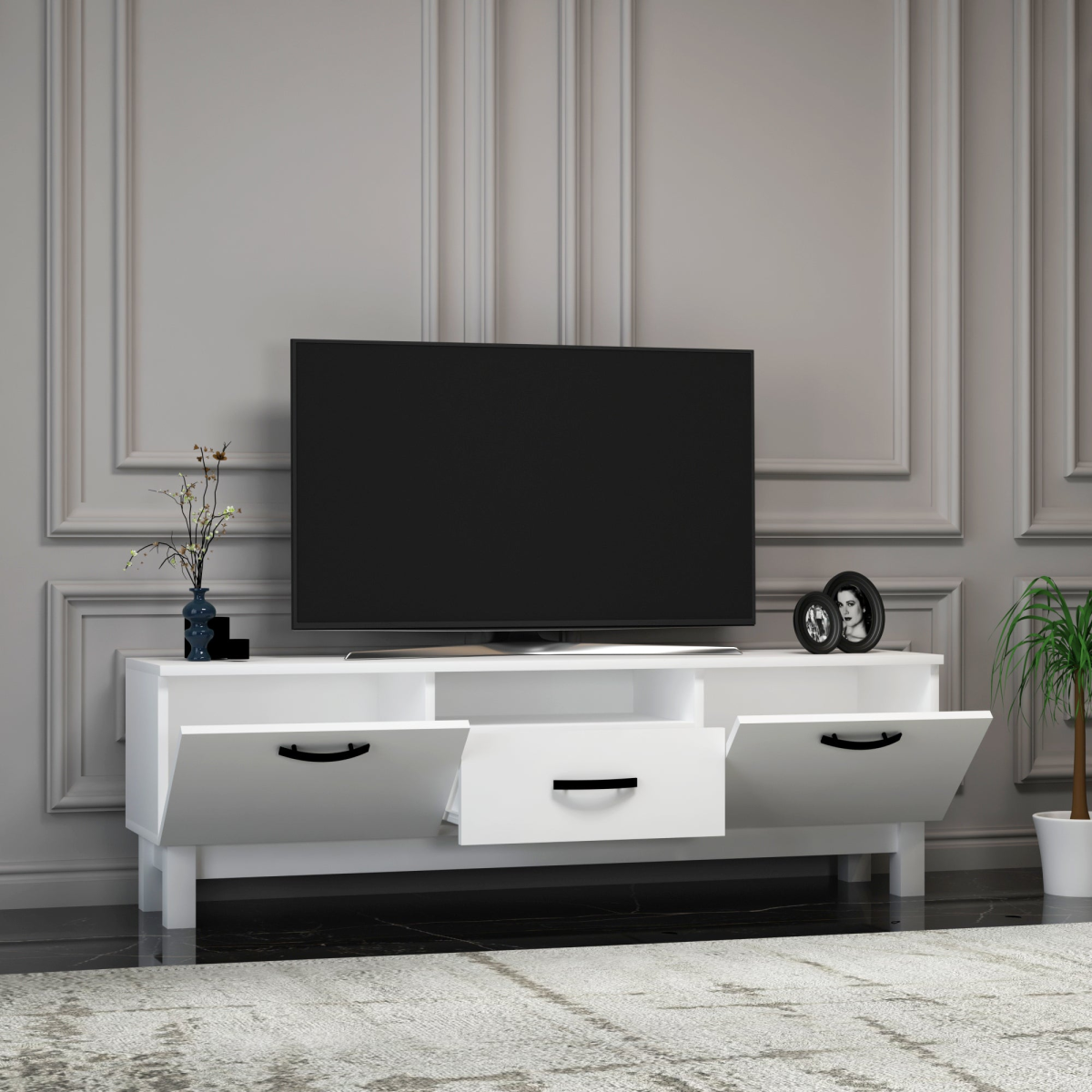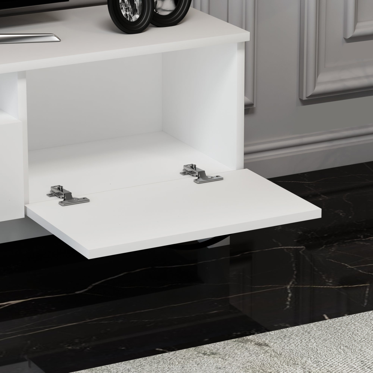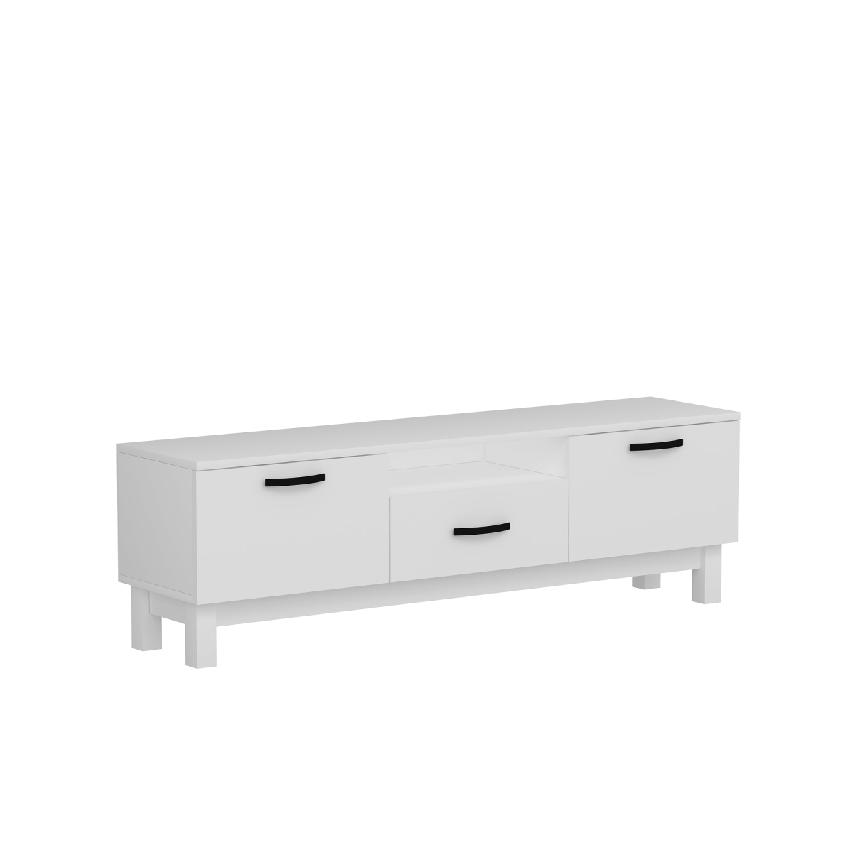 MATERIAL: The TV Stand is made of an 18 mm thick quality melamine-coated particleboard. The manufactured wood surface is water-resistant to some extent and the edges are banded with PVC edge banding tape. Door handles are quality iron metal. First-class assembly/installation hardware and accessories are used. Our products are produced from certified quality raw materials that do not contain carcinogenic substances and comply with European Union health norms.