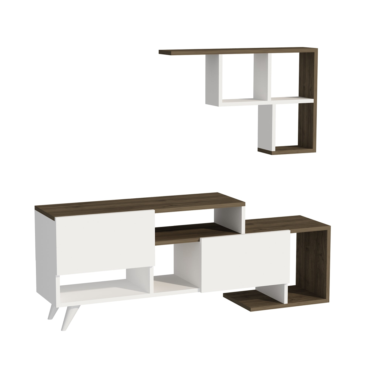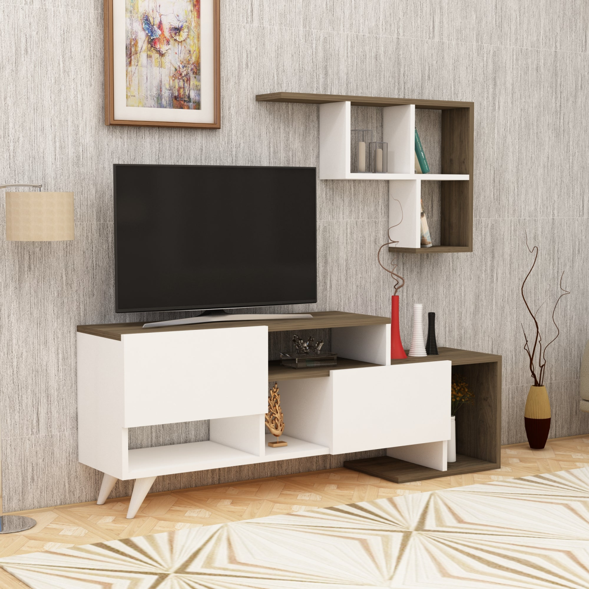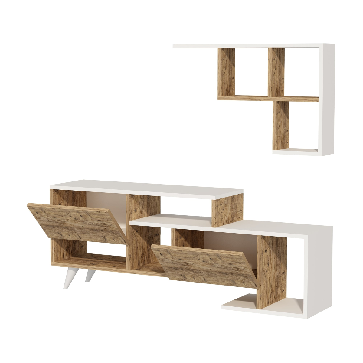 Upgrade your living room with our TV Stand and Entertainment Center Pilmin. This modern unit features a wall shelving unit with a cabinet, two cabinets, and seven open shelves for storage. Made of durable 18 mm thick particleboard, it can accommodate flat-screen TVs up to 40 inches. Its water-resistant engineered wood surface and solid plastic legs make it a long-lasting addition to your home.