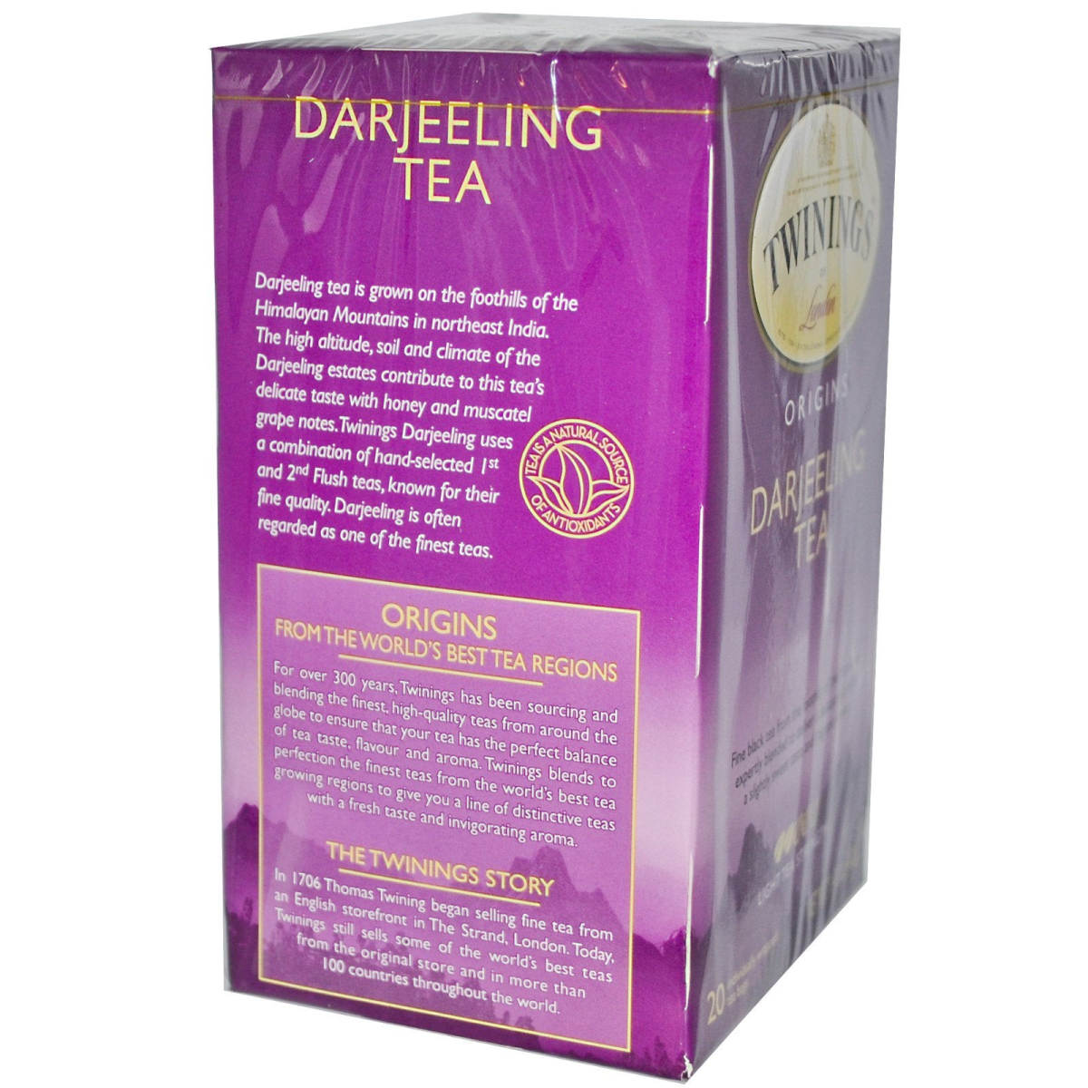 By Appointment to Her Majesty Queen Elizabeth II Of London Fine Black Tea from the Foothills of the Himalayas Expertly Blended to Deliver a Delicate Tea with a Slightly Sweet Taste and Fragrant Aroma. Light Tea Strength 20 Individually Wrapped Tea Bags Kosher Teas Natural Source of Antioxidants Origins: from the world's best tea regions Darjeeling tea is grown on the foothills of the Himalayan Mountains in northeast India. The high altitude, soil and climate of the Darjeeling estates contribute to this tea's delicate taste with honey and muscatel grape notes. Twinings Darjeeling uses a combination of hand-selected 1st and 2nd Flush teas, known for their fine quality. Darjeeling is often regarded as one of the finest teas. Origins From the World's Best Tea Regions For over 300 years, Twinings has been sourcing and blending the finest, high-quality teas from around the globe to ensure that your tea has the perfect balance of tea taste, flavour and aroma. Twinings blends to perfection the finest teas from the world's best tea growing regions to give you a line of distinctive teas with a fresh taste and invigorating aroma. The Twinings Story In 1706 Thomas Twining began selling fine tea from an English storefront in The Strand, London. Today, Twinings still sells some of the world's best teas from the original store and in more than 100 countries throughout the world.