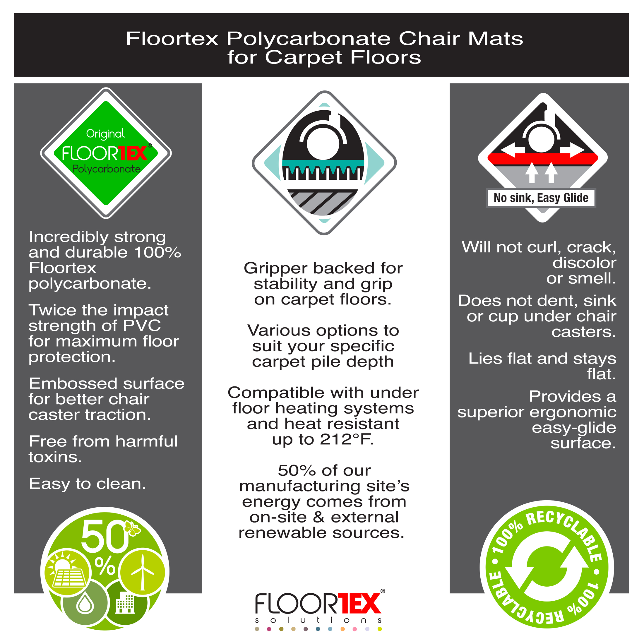 Cleartex Ultimat polycarbonate chair mats are the ultimate in quality and durability in floor protection and ergonomics. These high clarity chairmats for carpeted flooring are made from Floortex Original polycarbonate, which has double the impact strength of PVC and will not crack, curl, discolour or smell.