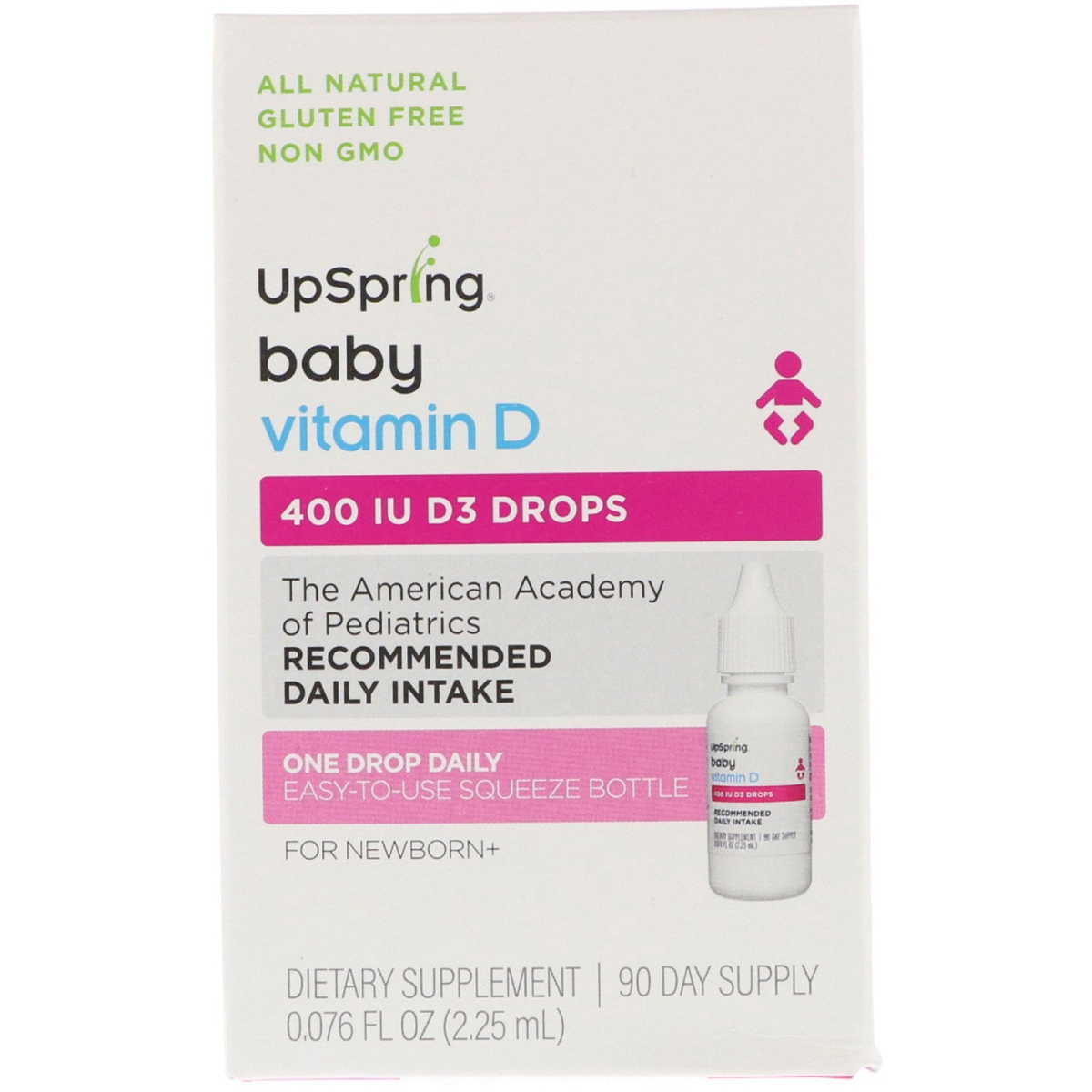 All Natural Gluten Free Non-GMO 400 IU D3 Drops The American Academy of Pediatrics Recommended Daily Intake One Drop Daily Easy-to-Use Squeeze Bottle For Newborn+ Dietary Supplement 90 Day Supply No Artificial, Colors, Flavors or Sugars Made with Love. Backed by Science. Women Owned The American Academy of Pediatrics (AAP) recommends supplementing 400 IU of Vitamin D3 daily for breastfed and formula fed babies consuming less than 32 oz of milk daily. Upspring Baby Vitamin D provides Vitamin D3 in one concentrated serving so it easy for baby to take and with less mess - no coloring with can stain, UpSpring Baby Vitamin D promotes calcium absorption to support healthy development of bones and teeth. 400 IU Vitamin D3 One Drop All Natural Ingredients Promotes Healthy Bones + Teeth No Coloring Which Can Stain Tasteless + Odorless