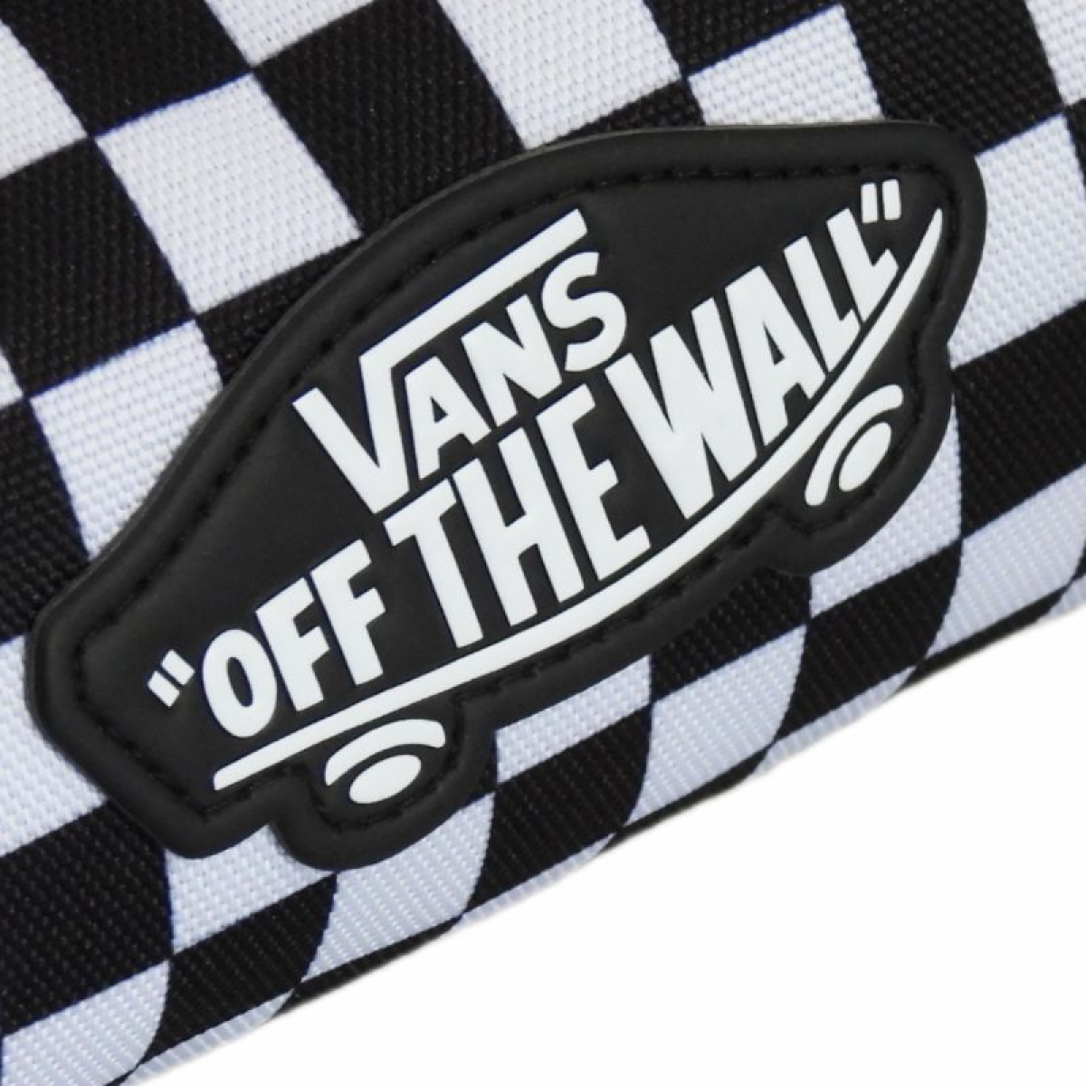 A school bag with the iconic checkerboard motif and a rubber patch with the Vans skateboard logo.