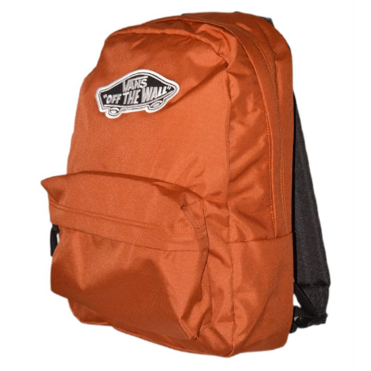 On the front of the city backpack there is a patch with the VANSOFF THE WALL brand logo - a skateboard.