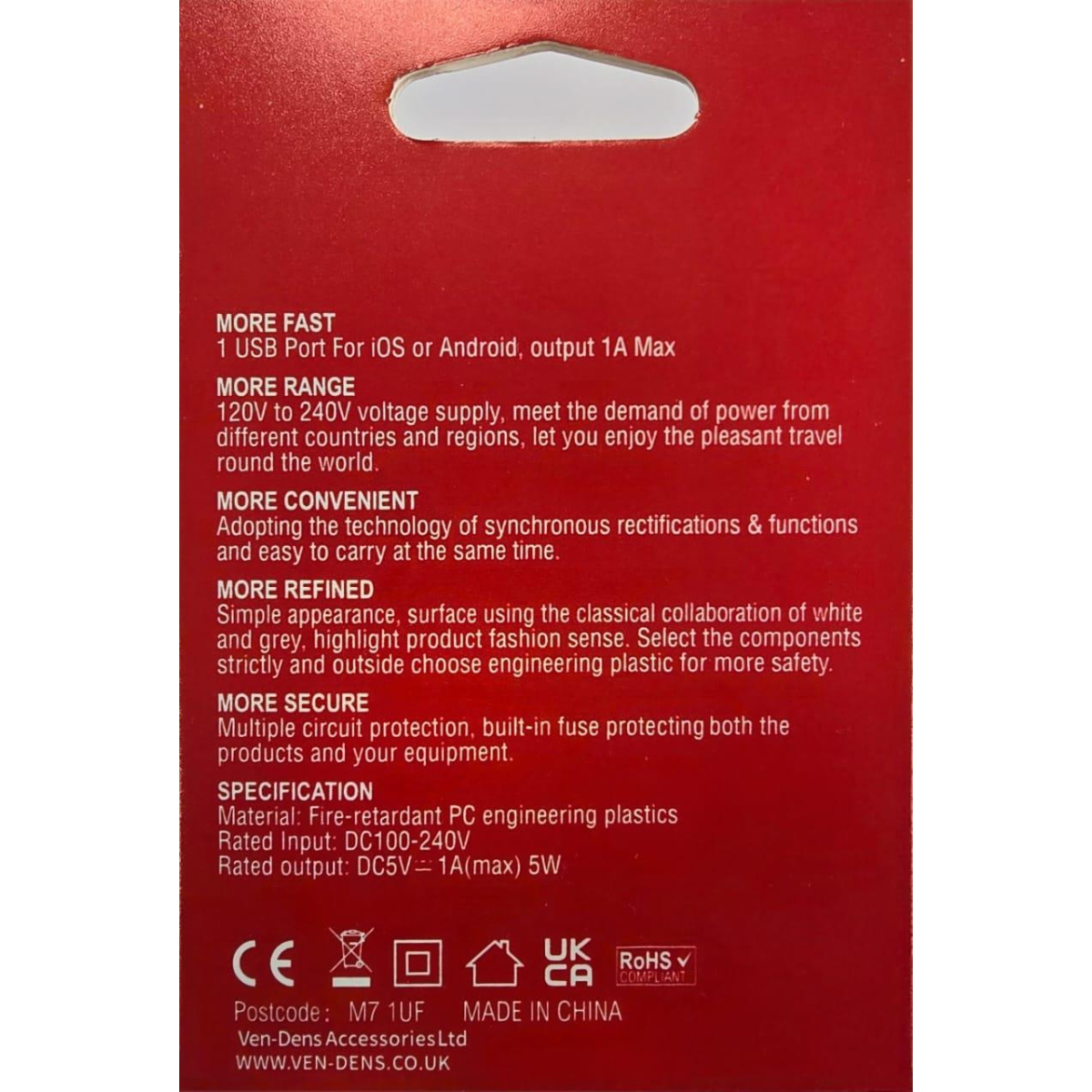 - MORE SECURE Multiple circuit protection, built-in fuse protecting both the products and your equipment. SPECIFICATION Material: Fire-retardant PC engineering plastics Rated Input: DC100-240V Rated output: DC5V- 1A(max) 5W