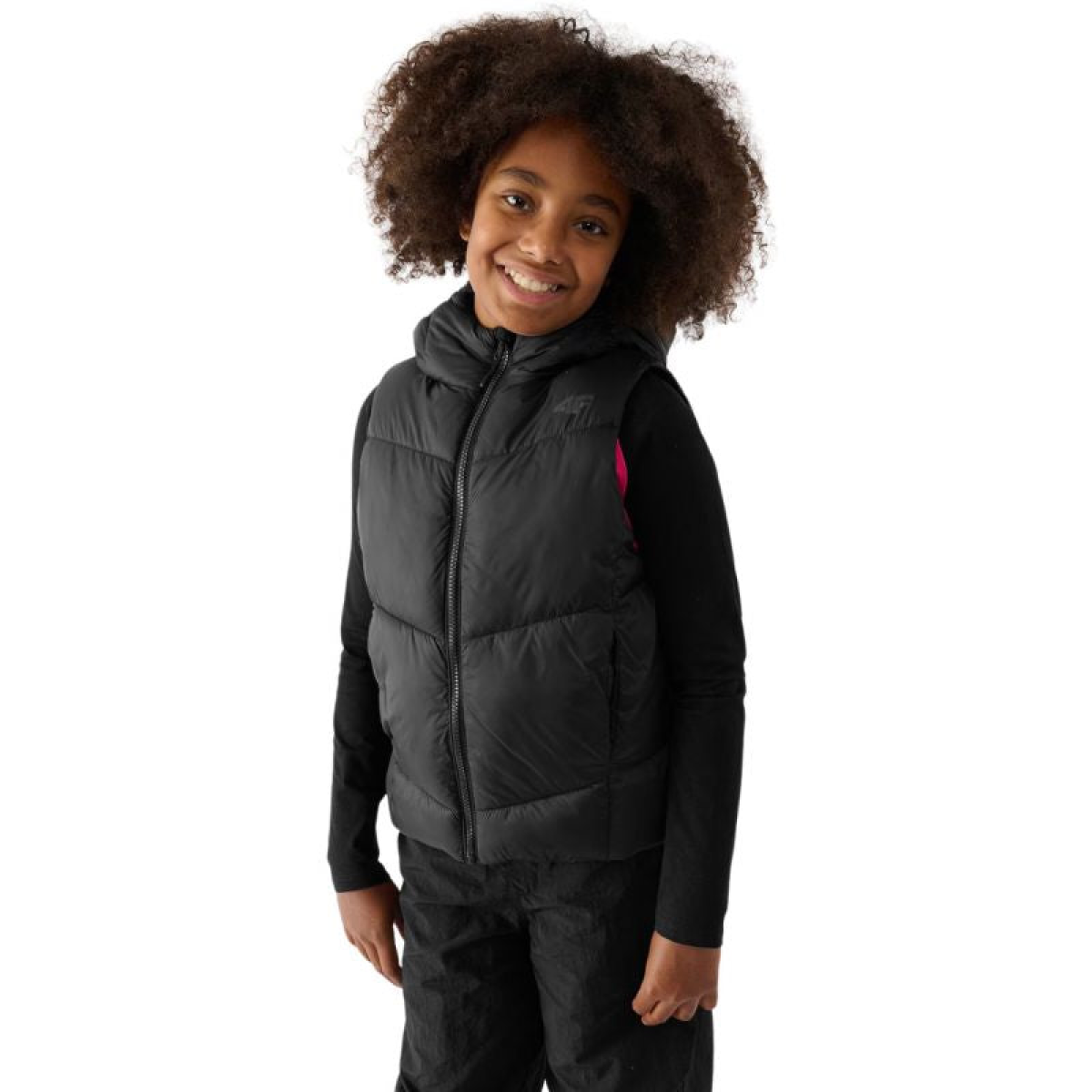 Vest for girls 4F F129 deep black 4FJWAW24TVJAF129 4F vest for girls is perfect for everyday wear. cut: regular, which comfortably fits the figure. Standard cut reaching to the hips. Herringbone quilting. Polyester, smooth lining. Hydrophobic coating of the outer material limits moisture absorption. Integrated hood without adjustment. 2 open side pockets. One-way main zipper with internal wind flap. Non-adjustable bottom. Synthetic down filling provides adequate insulation properties even in humid conditions.